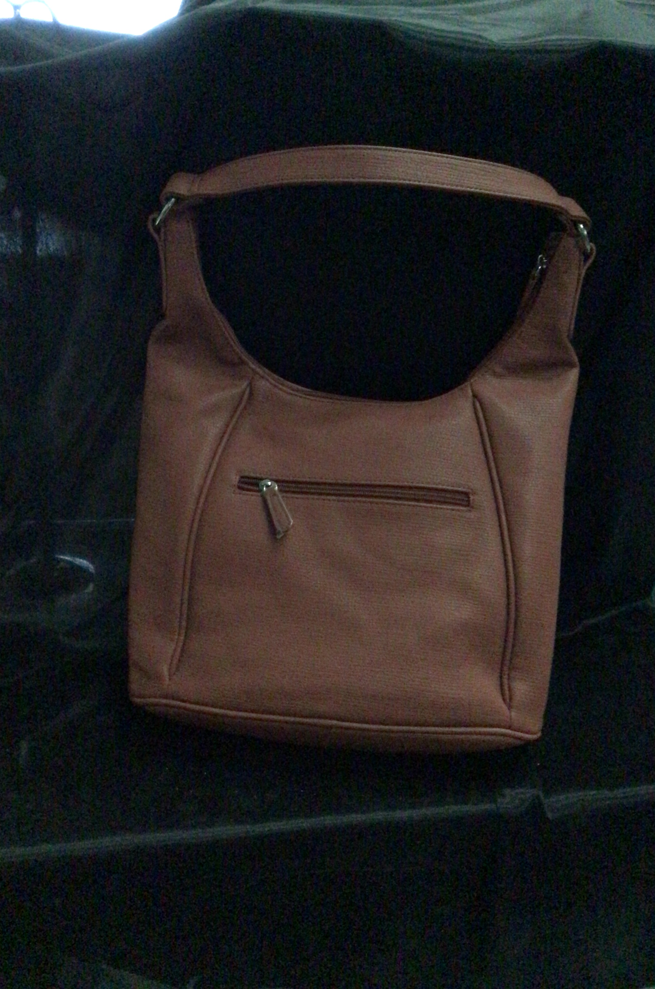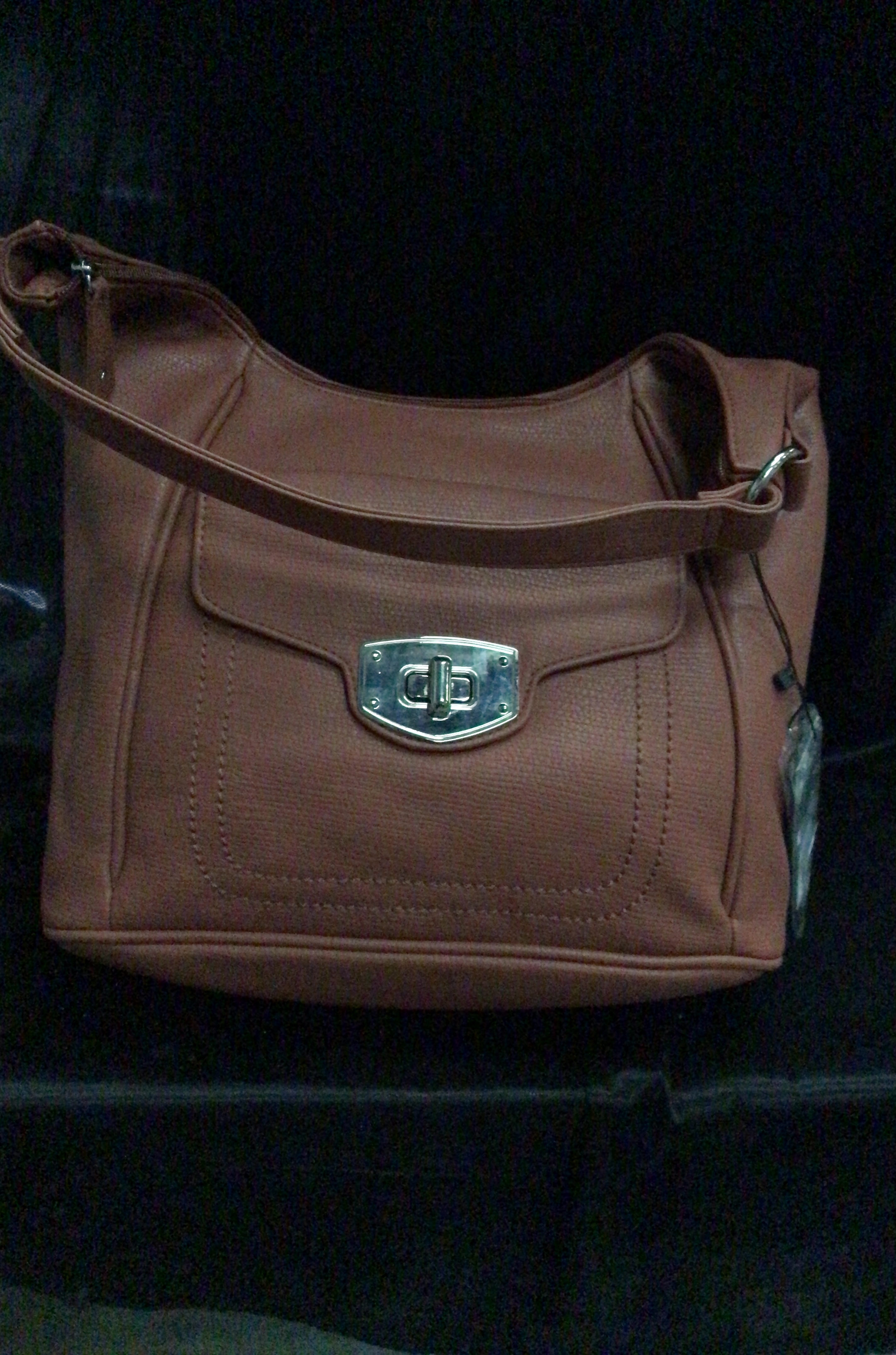This is a brown faux leather shoulder bag with a textured finish, flap closure, and silver-toned metal clasp.