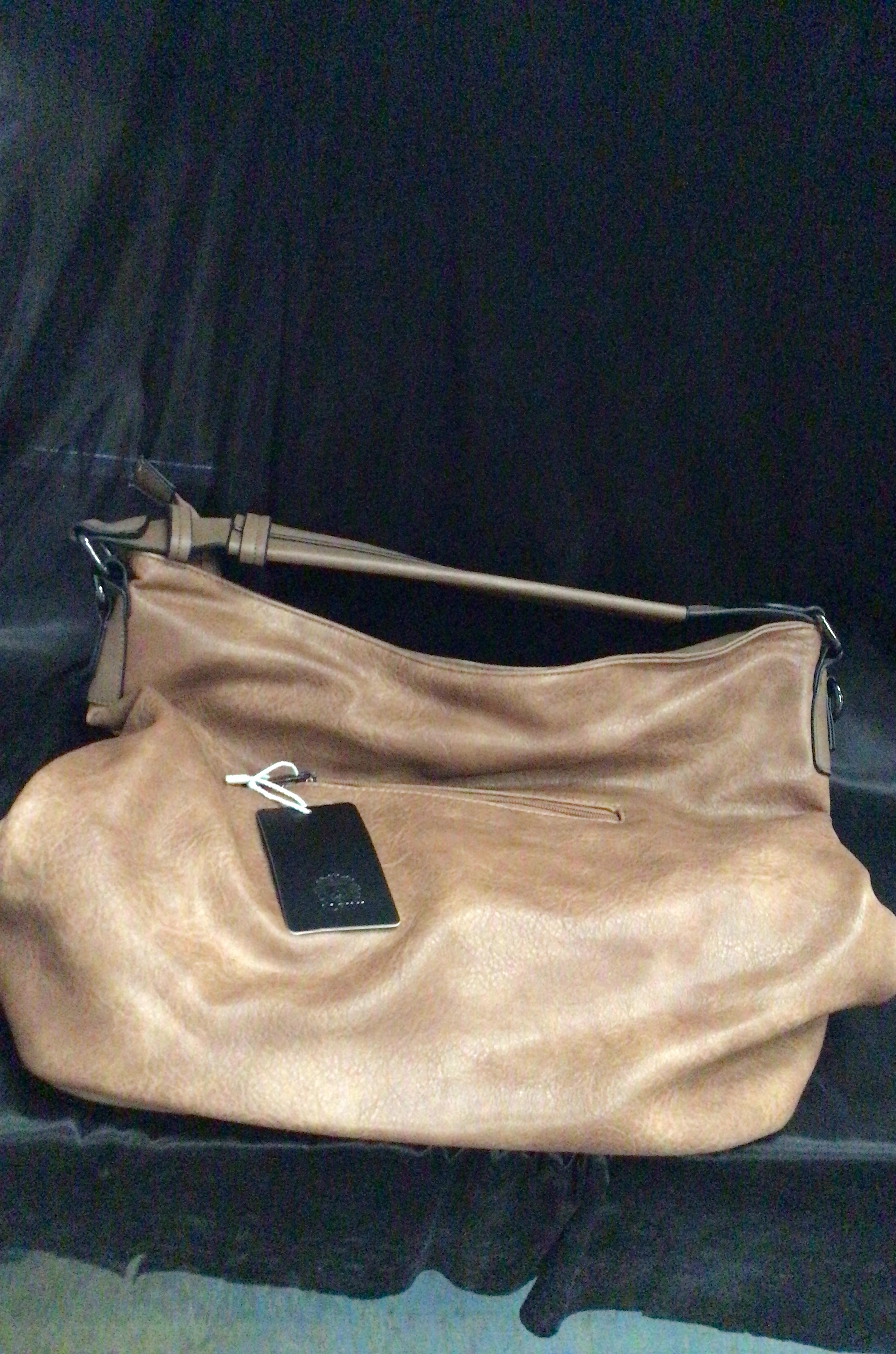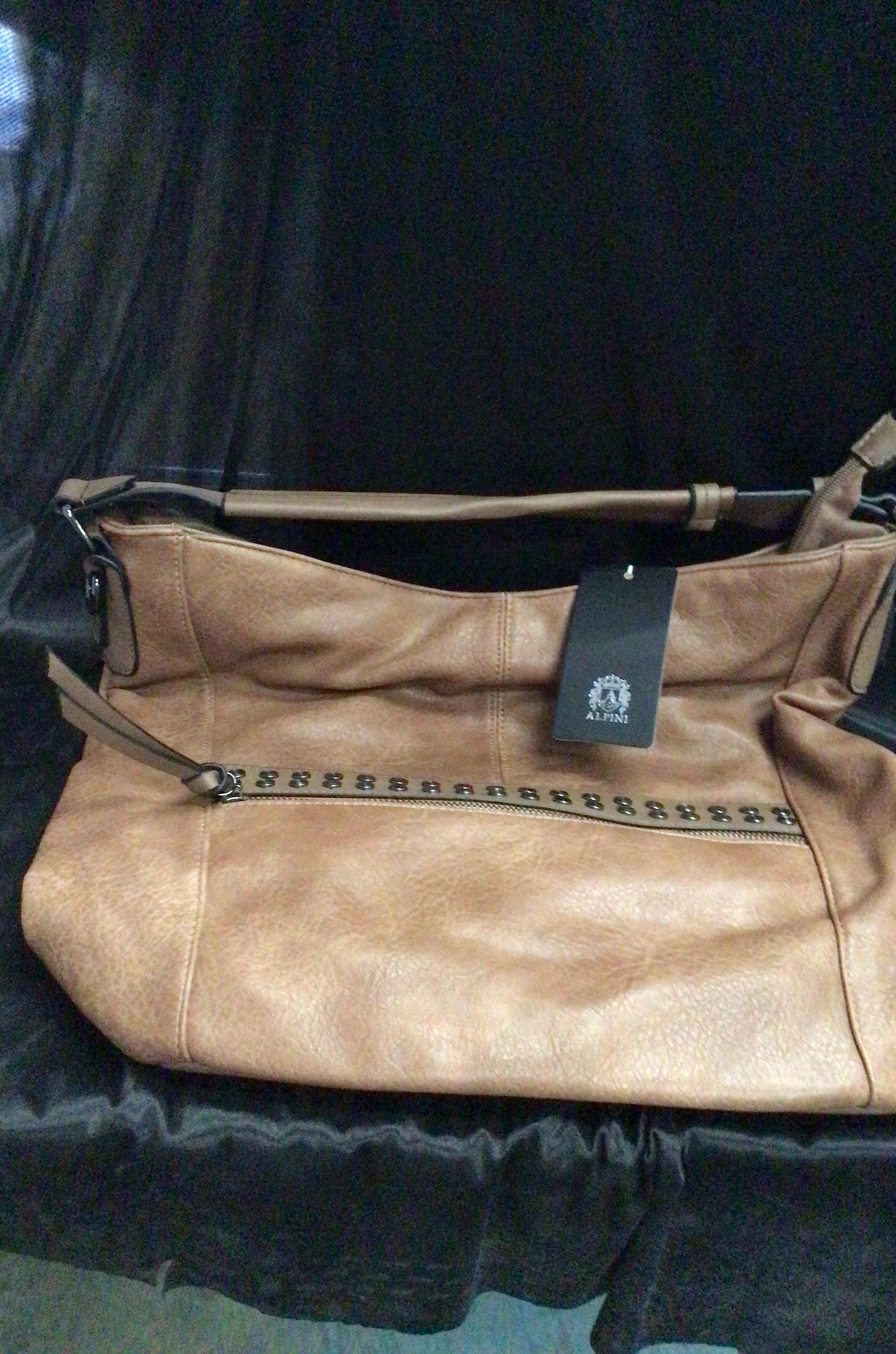 This is a light brown, slouchy handbag made of textured material with a single strap, a studded front zipper, and a back zippered pocket.