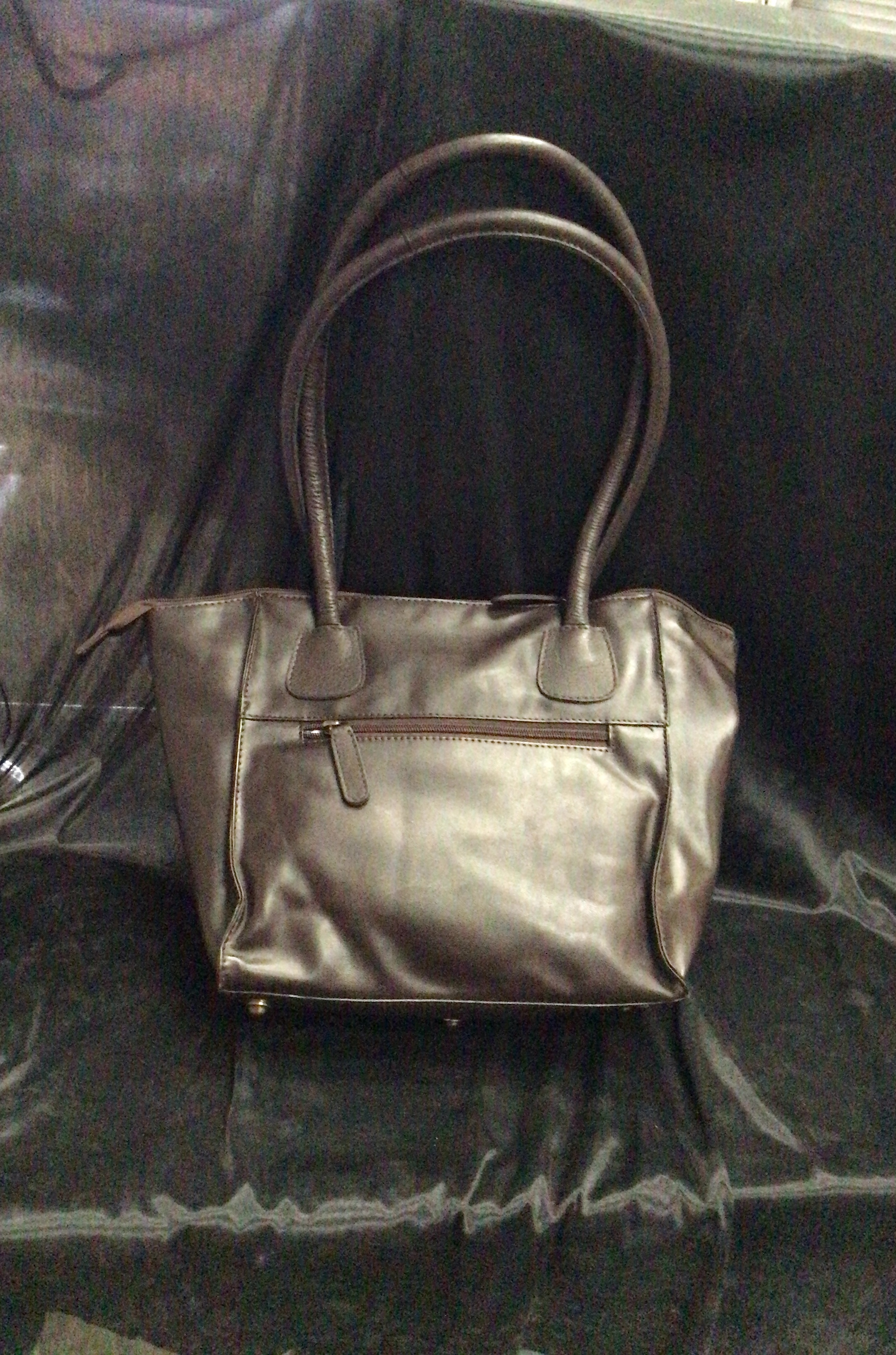 A dark brown leather tote bag with curved handles and a zippered front pocket.