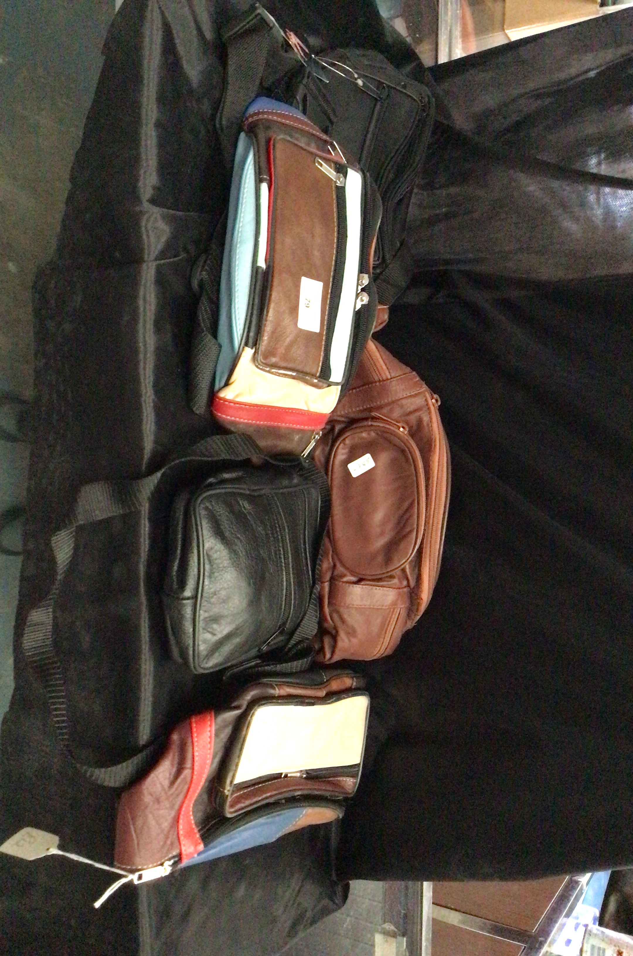 A collection of fanny packs including a multi-colored fabric option and two leather styles.