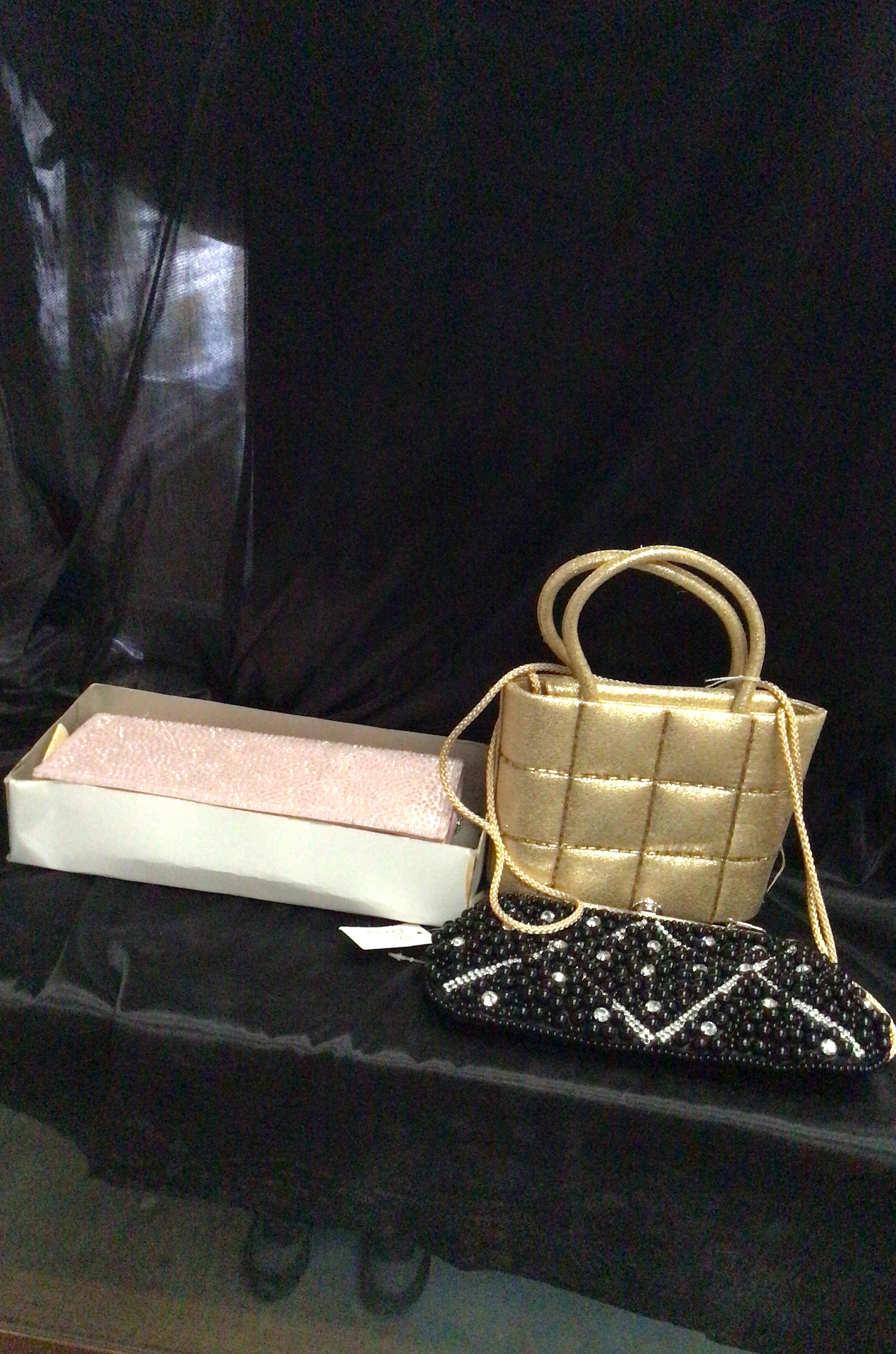 A collection of evening bags including a gold-toned quilted handbag and two beaded clutches.