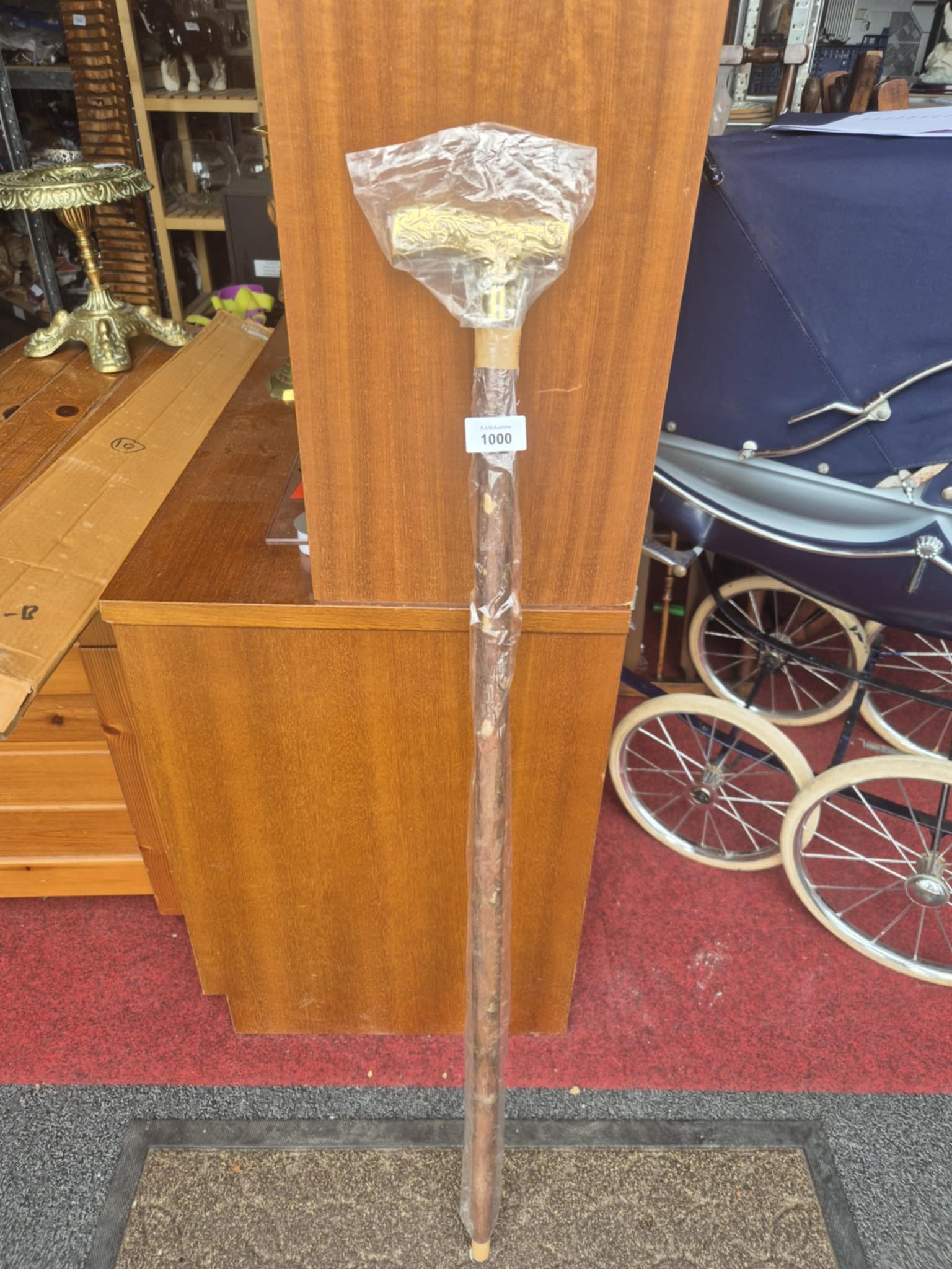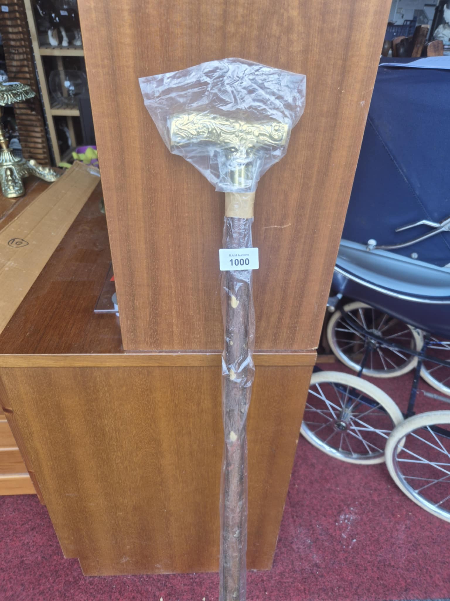 A wooden walking stick featuring a rectangular brass handle with an embossed floral pattern.