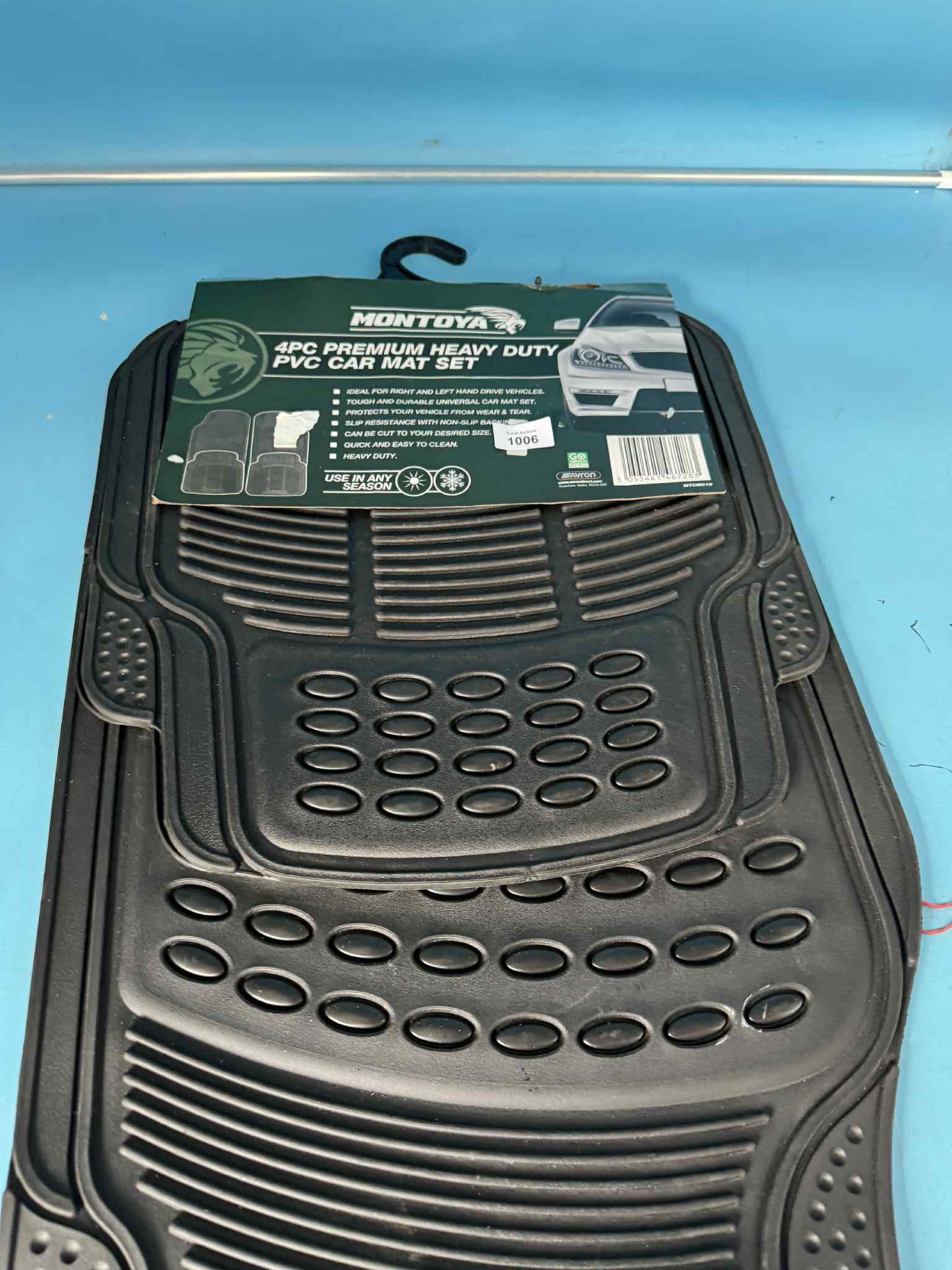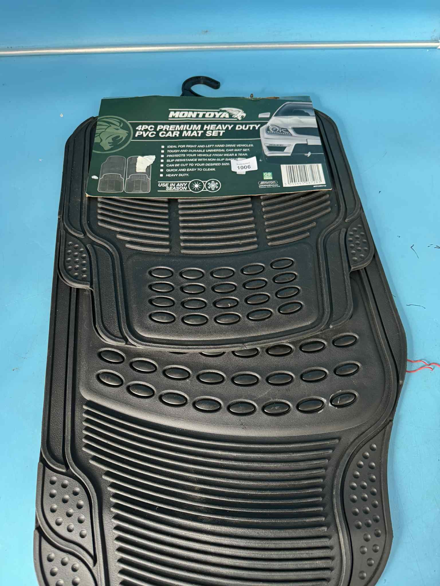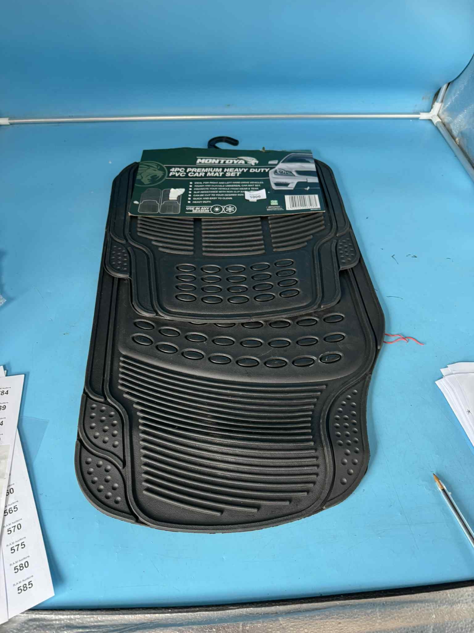 Black PVC car mats with textured surface and ribbed edges, packaged with cardboard.