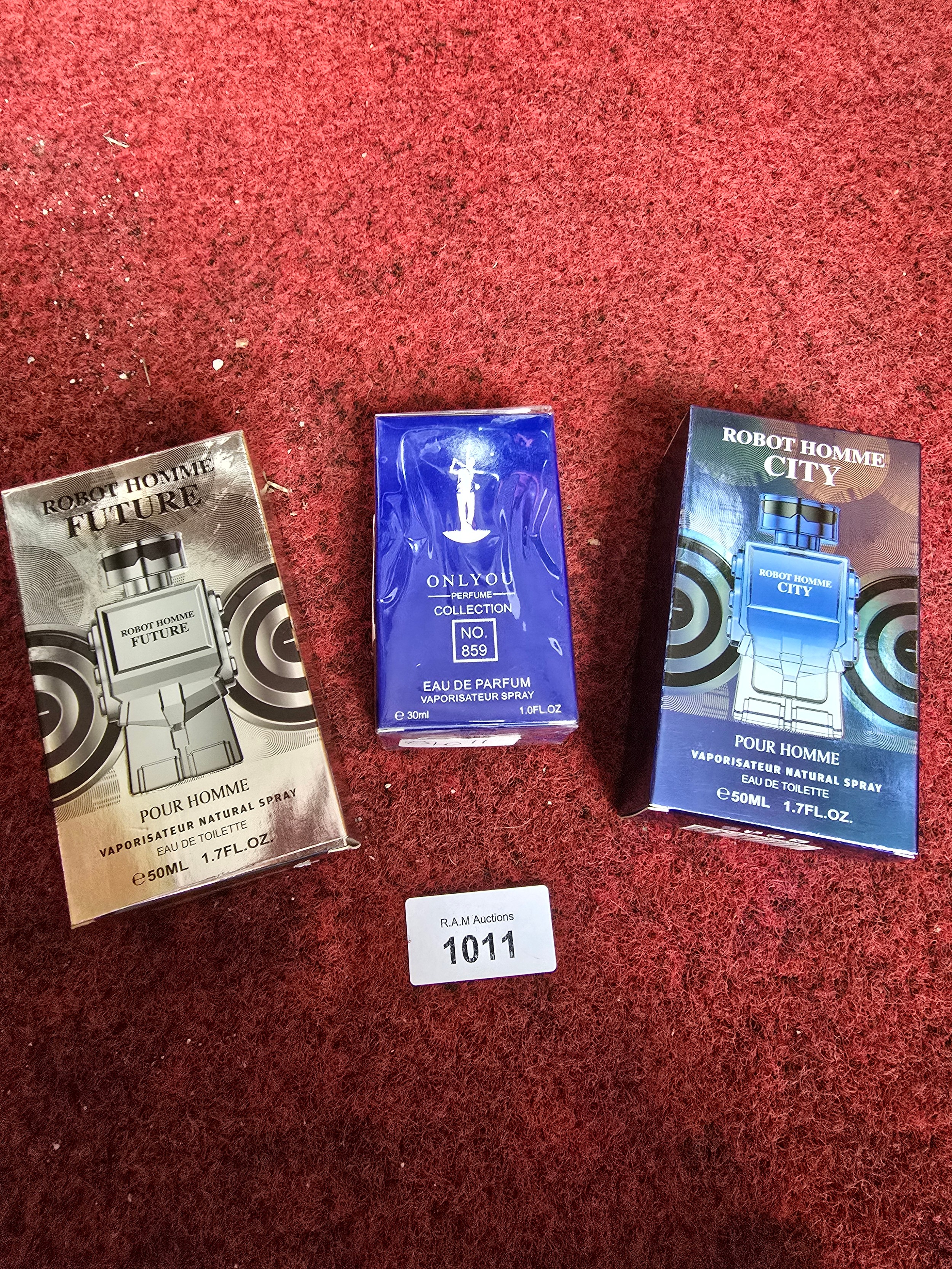 Three unopened perfume boxes: two Robot Homme Future and one Robot Homme City, plus an Onlyou Perfume Collection No. 859.