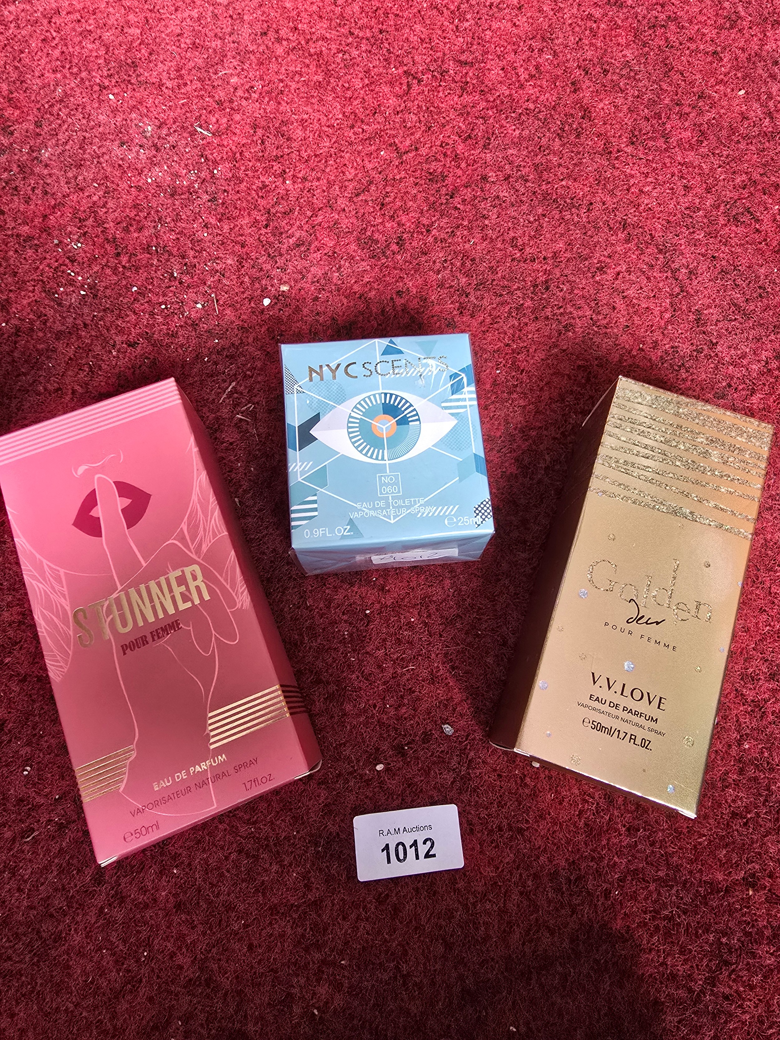 Three unopened perfume boxes: Stunner Pour Femme, NYC Scents No. 060, and Golden Dew Pour Femme.
