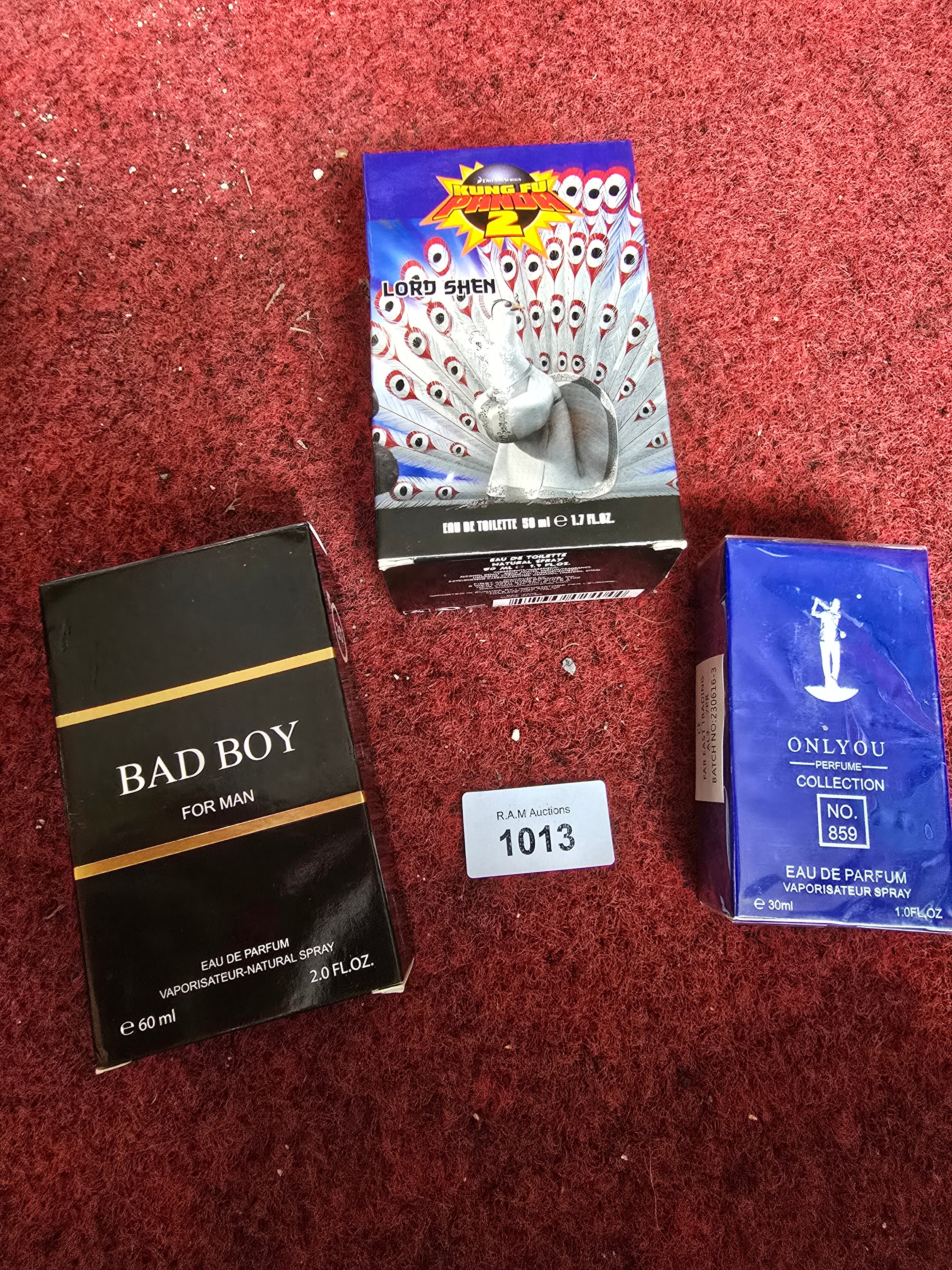 A collection of three perfume boxes featuring Bad Boy, Onlyou Perfume Collection No. 859, and Kung Fu Panda 2 Lord Shen fragrances.