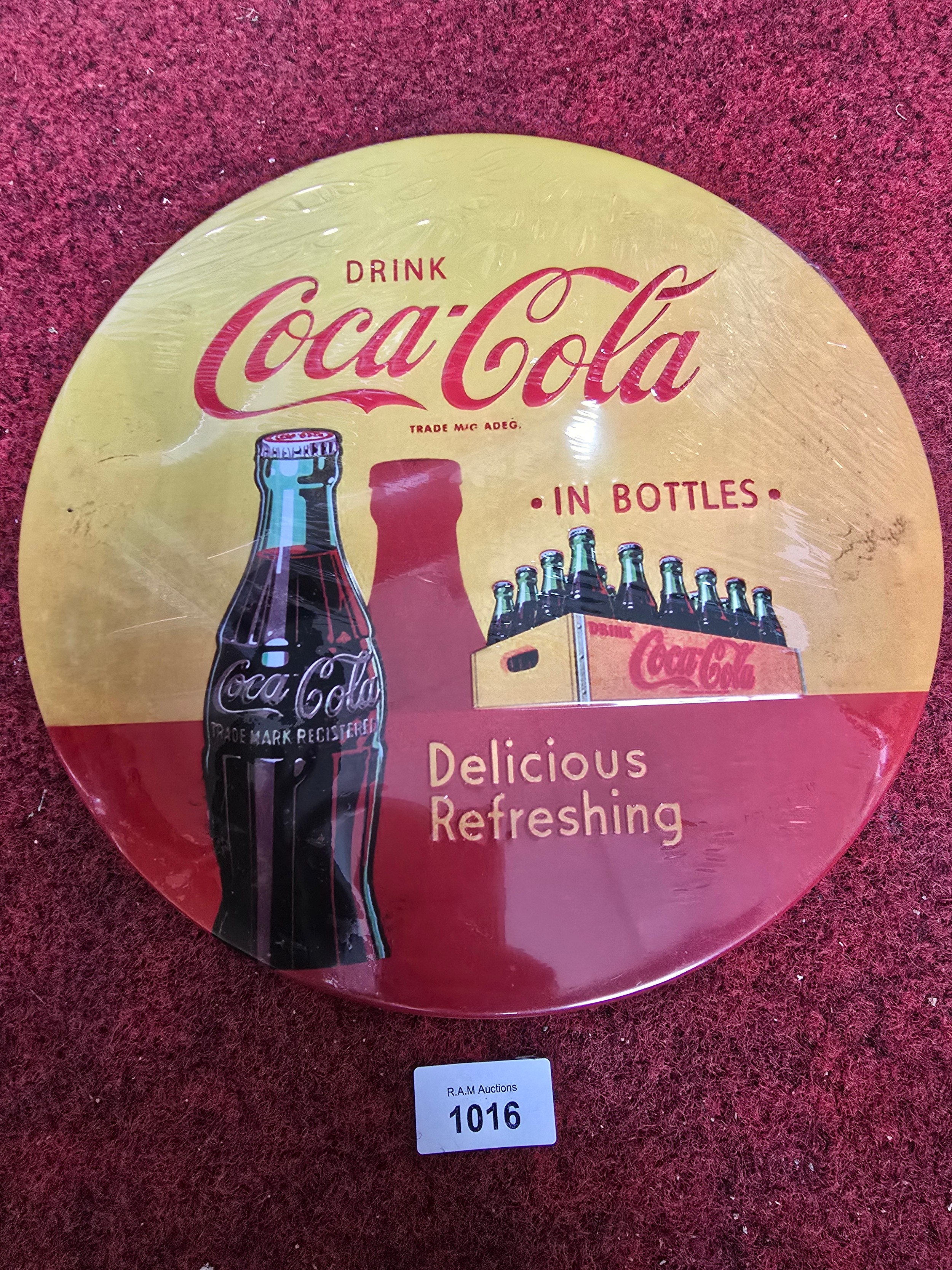 Red and yellow round metal Coca-Cola sign featuring a bottle and crate.