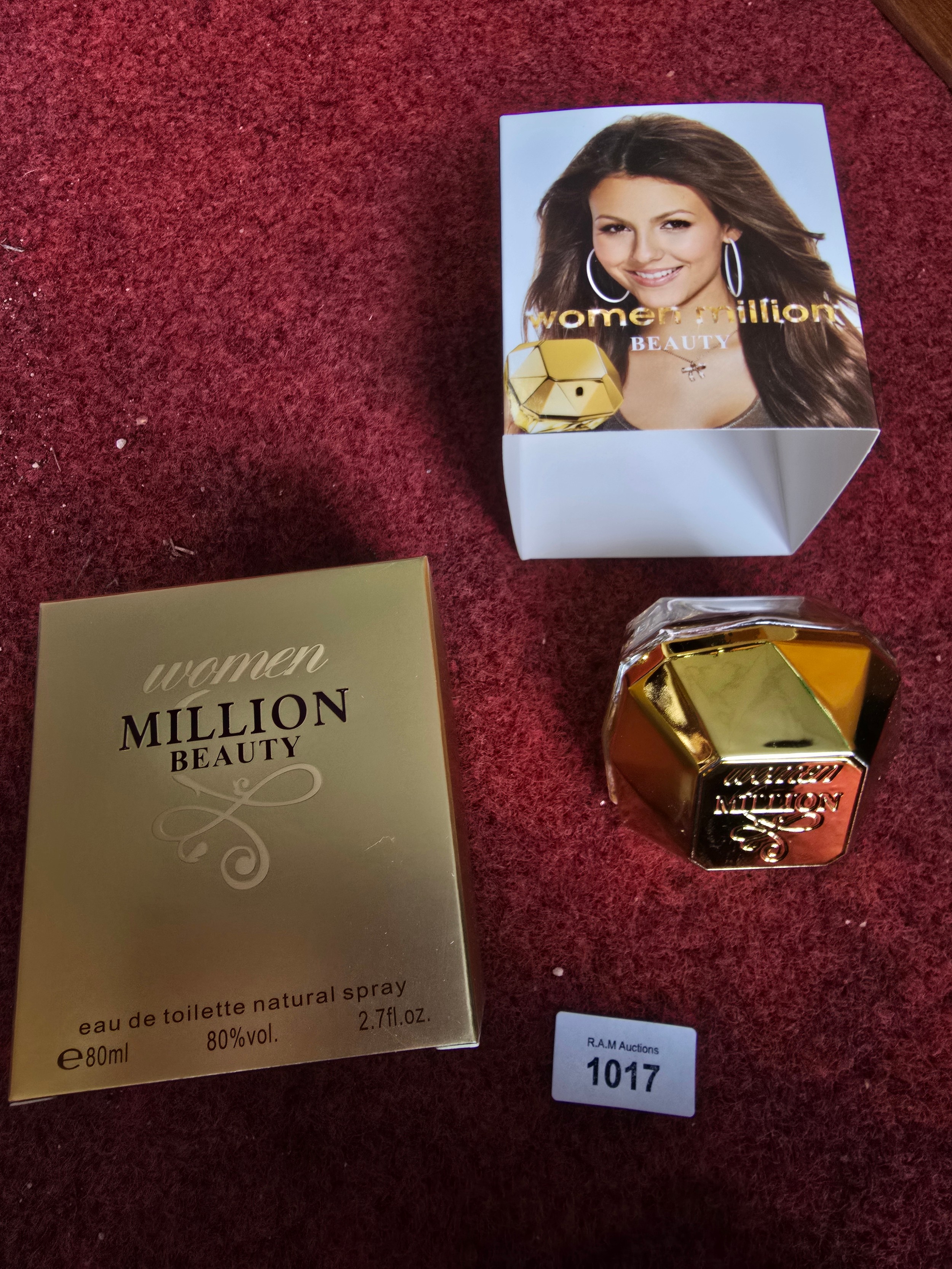 A faceted gold-colored perfume bottle and its original box, featuring “MILLION BEAUTY” branding.