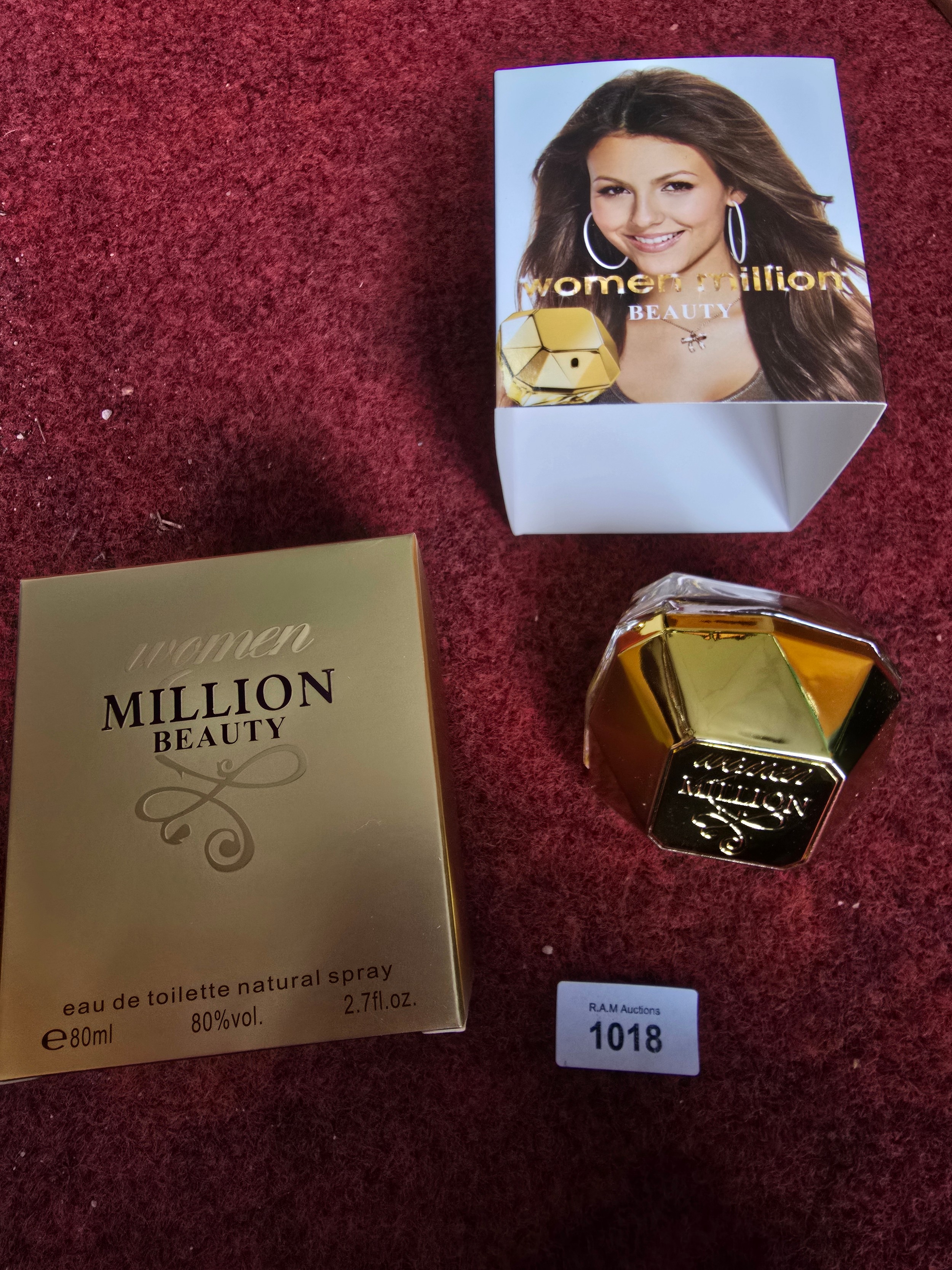 Gold-colored geometric faceted perfume bottle with “MILLION” on the base, presented in a gold box with “women MILLION BEAUTY” and an eau de toilette natural spray designation.