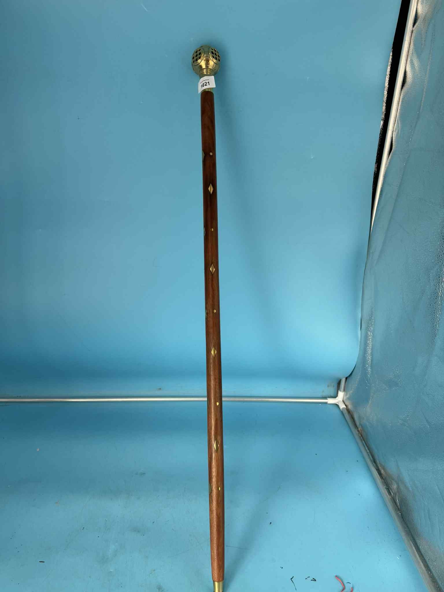 Dark wooden walking stick with inlaid brass diamond accents and a perforated spherical brass top.