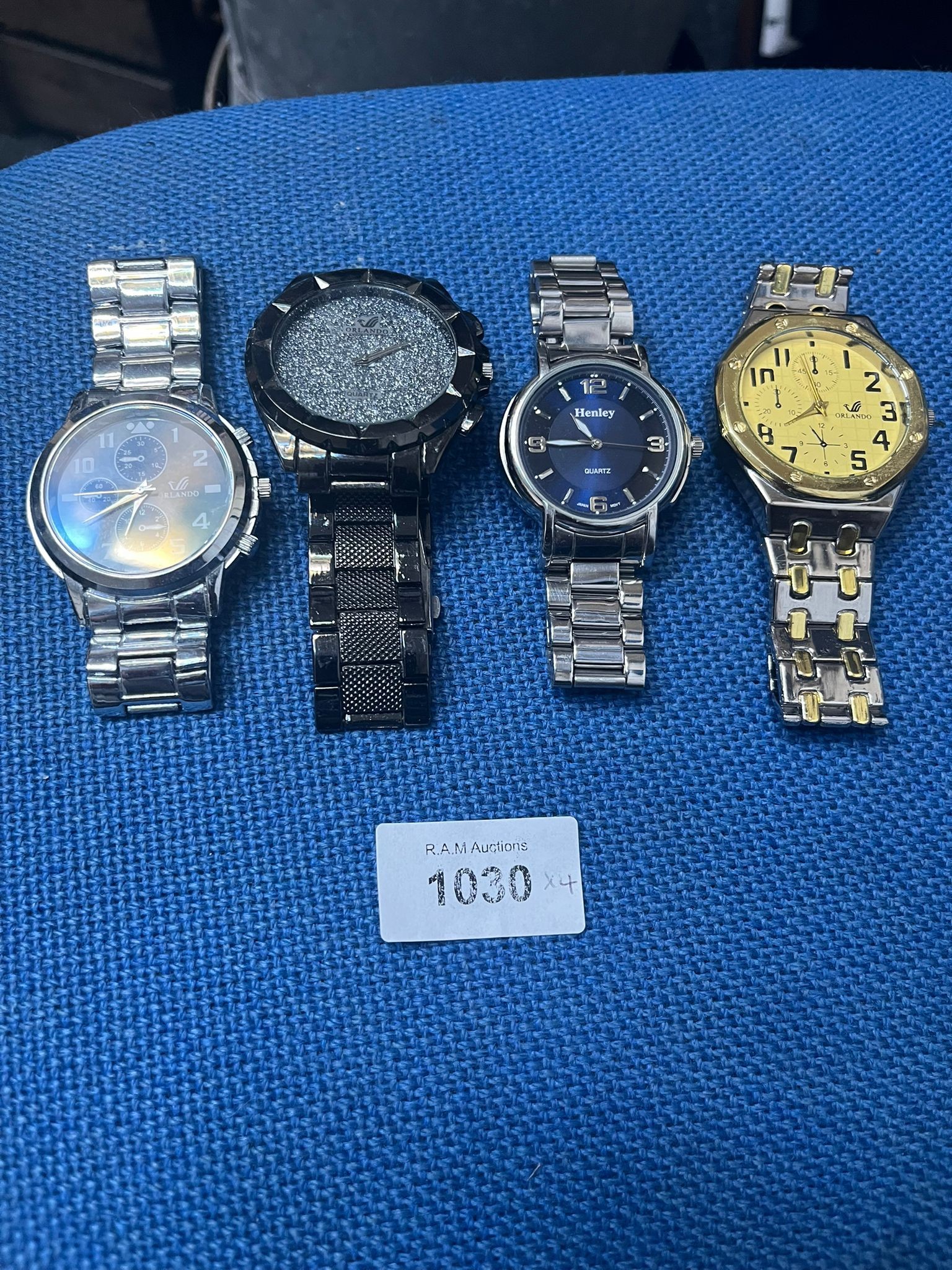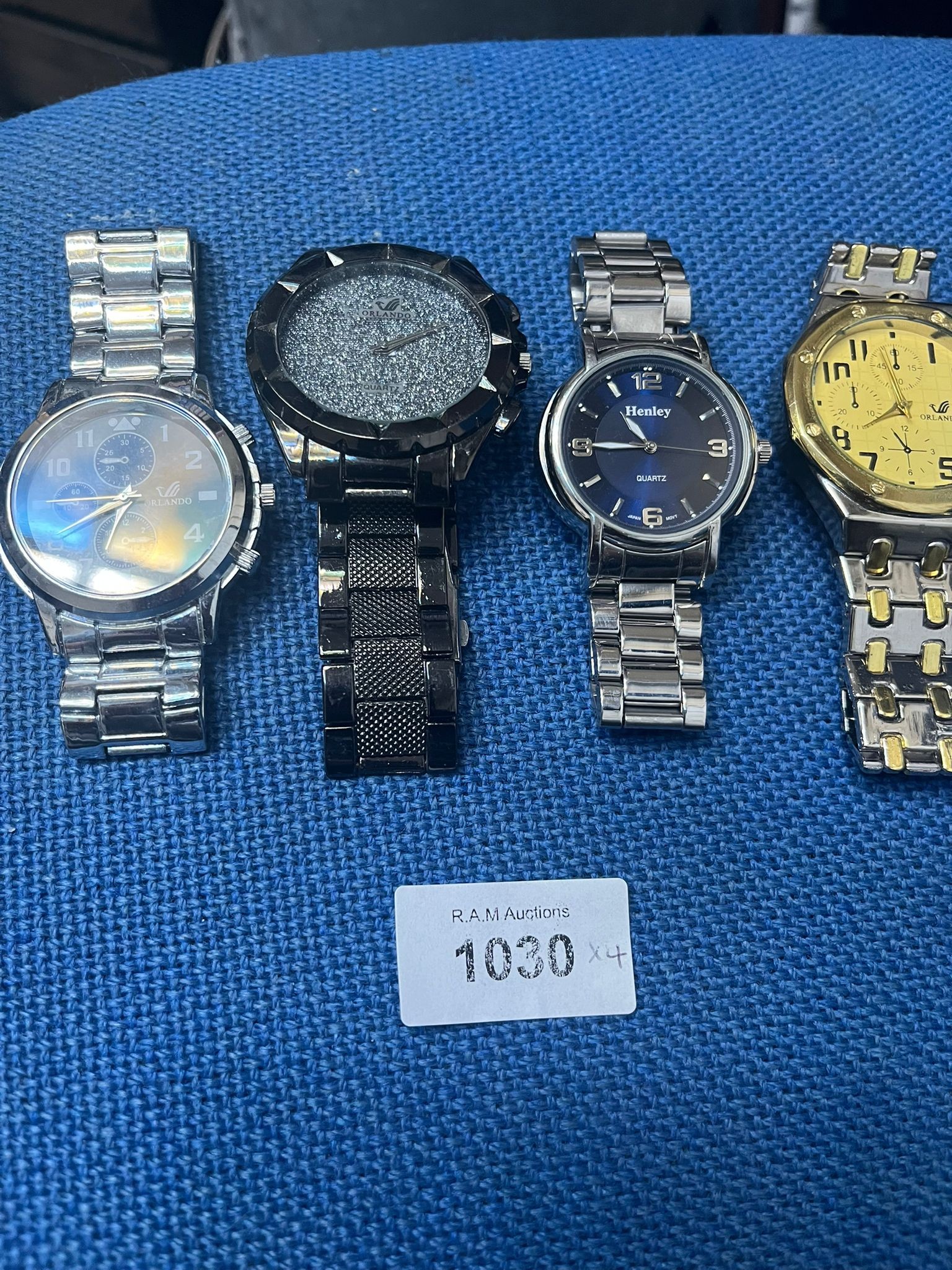 Collection of four wristwatches featuring various designs and materials.