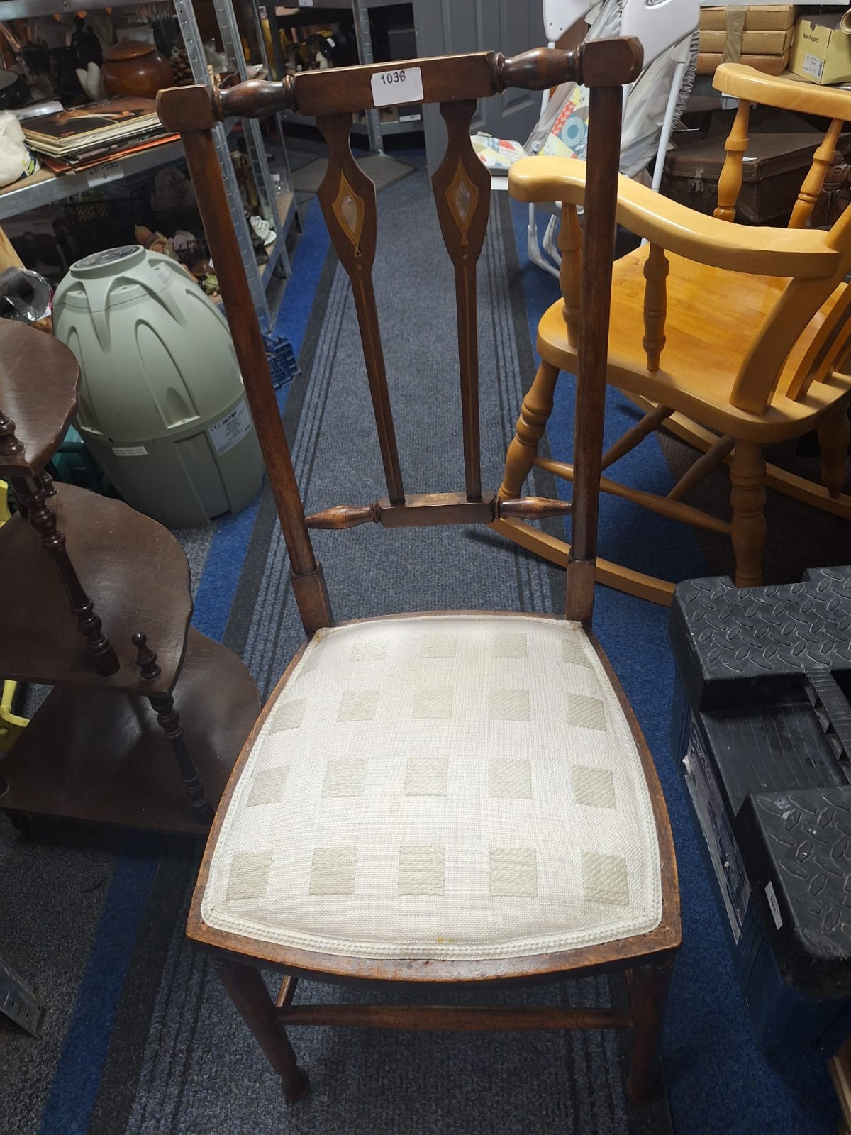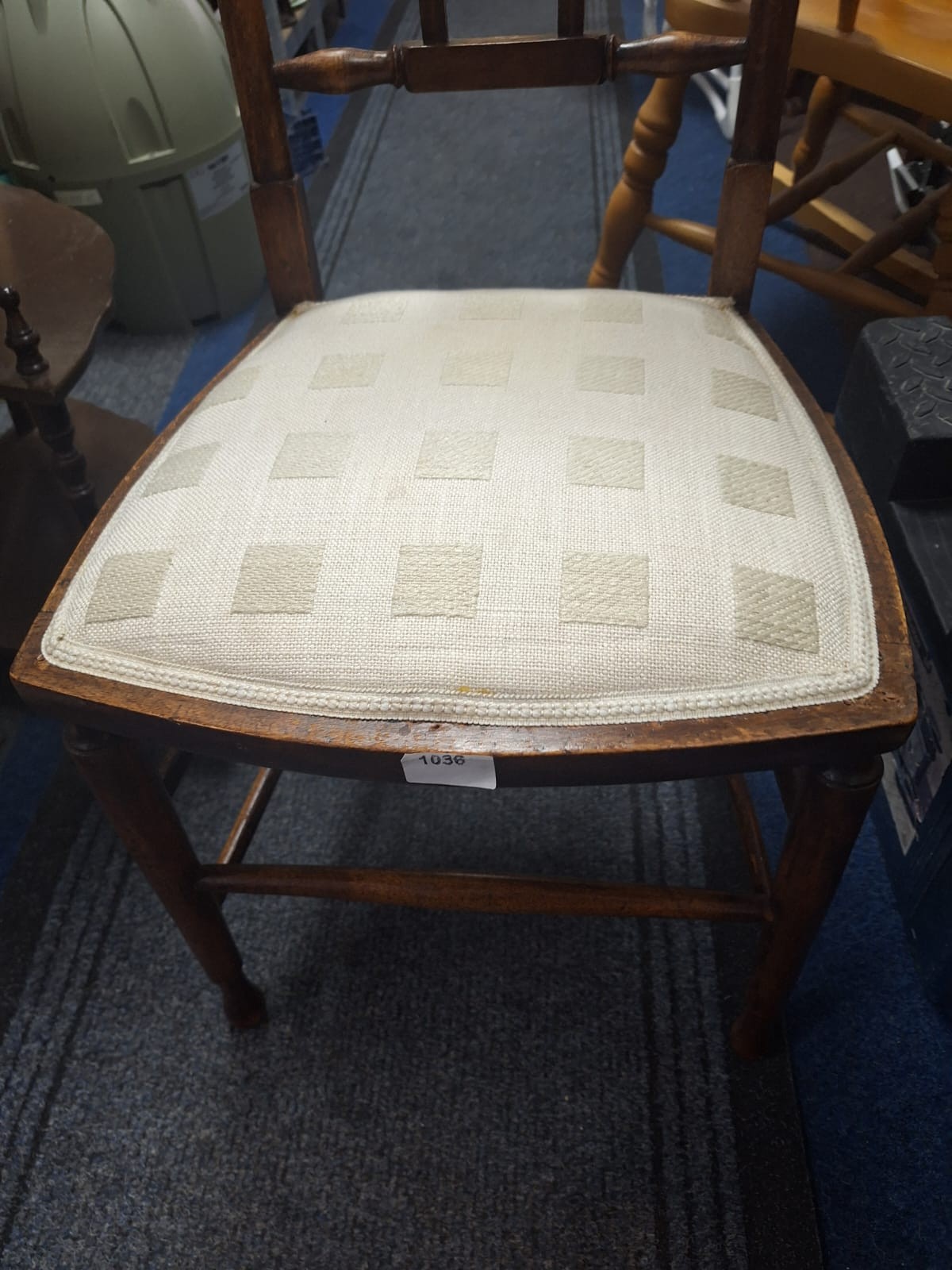 Dark brown wooden chair with a square, off-white geometric patterned upholstered seat and inlaid diamond design on the back.