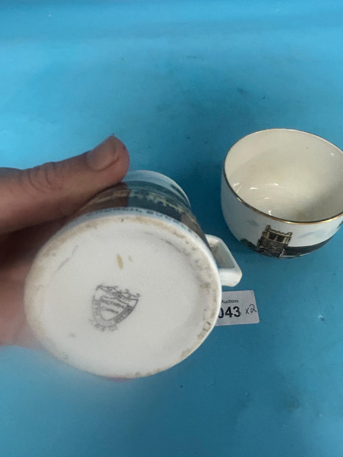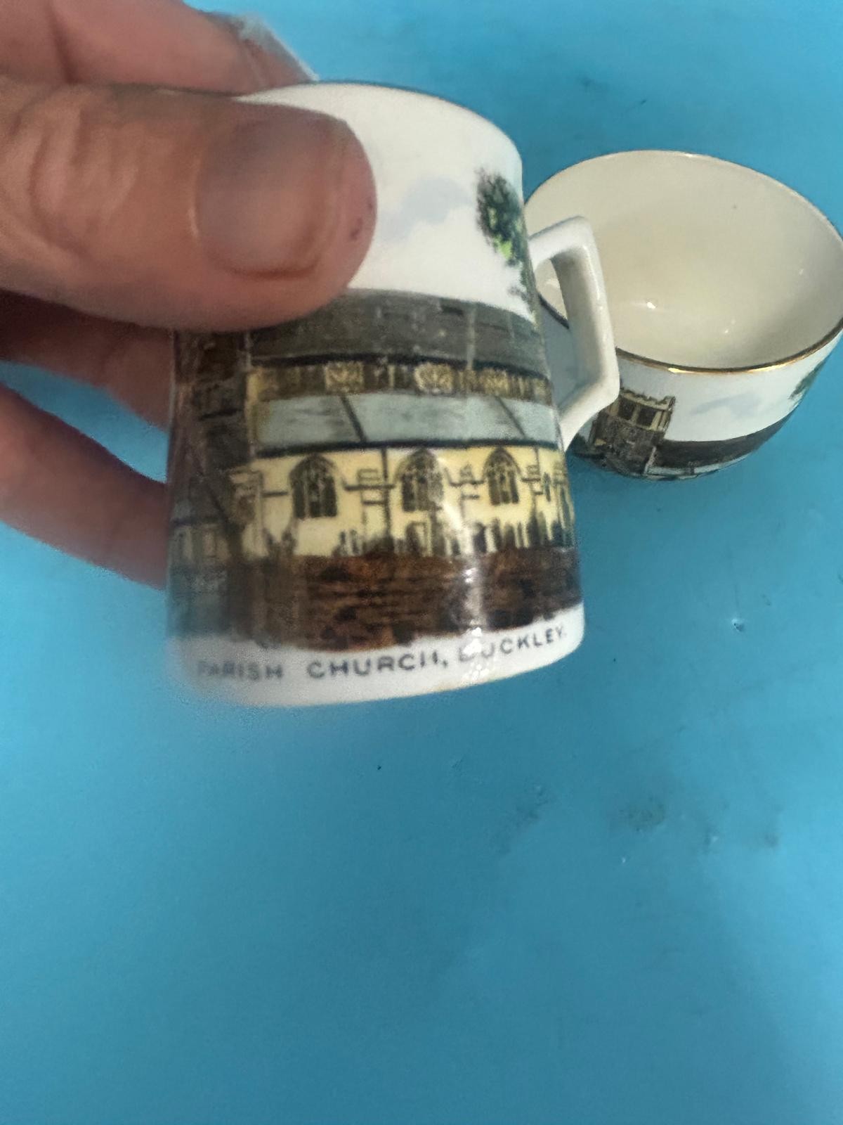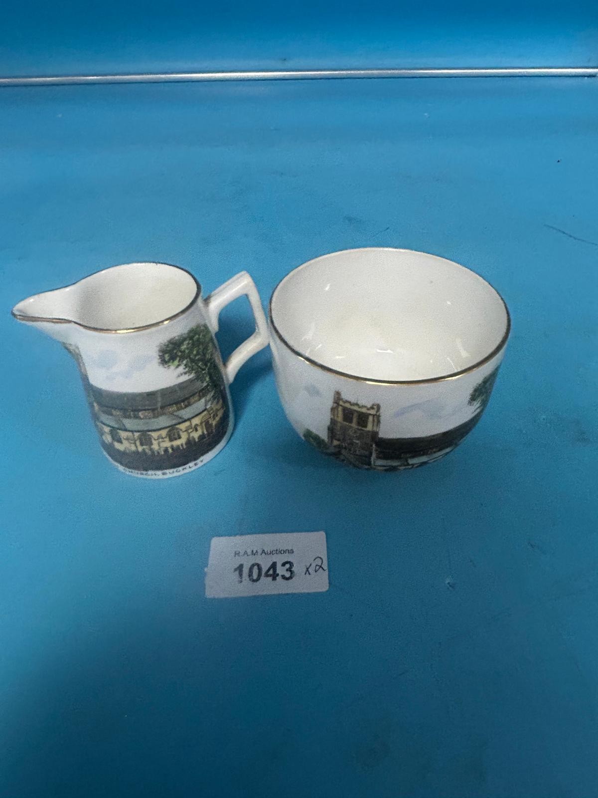 Cream-colored porcelain creamer and sugar bowl set featuring a printed image of the Parish Church, Luckley, and a gold band near the rim.