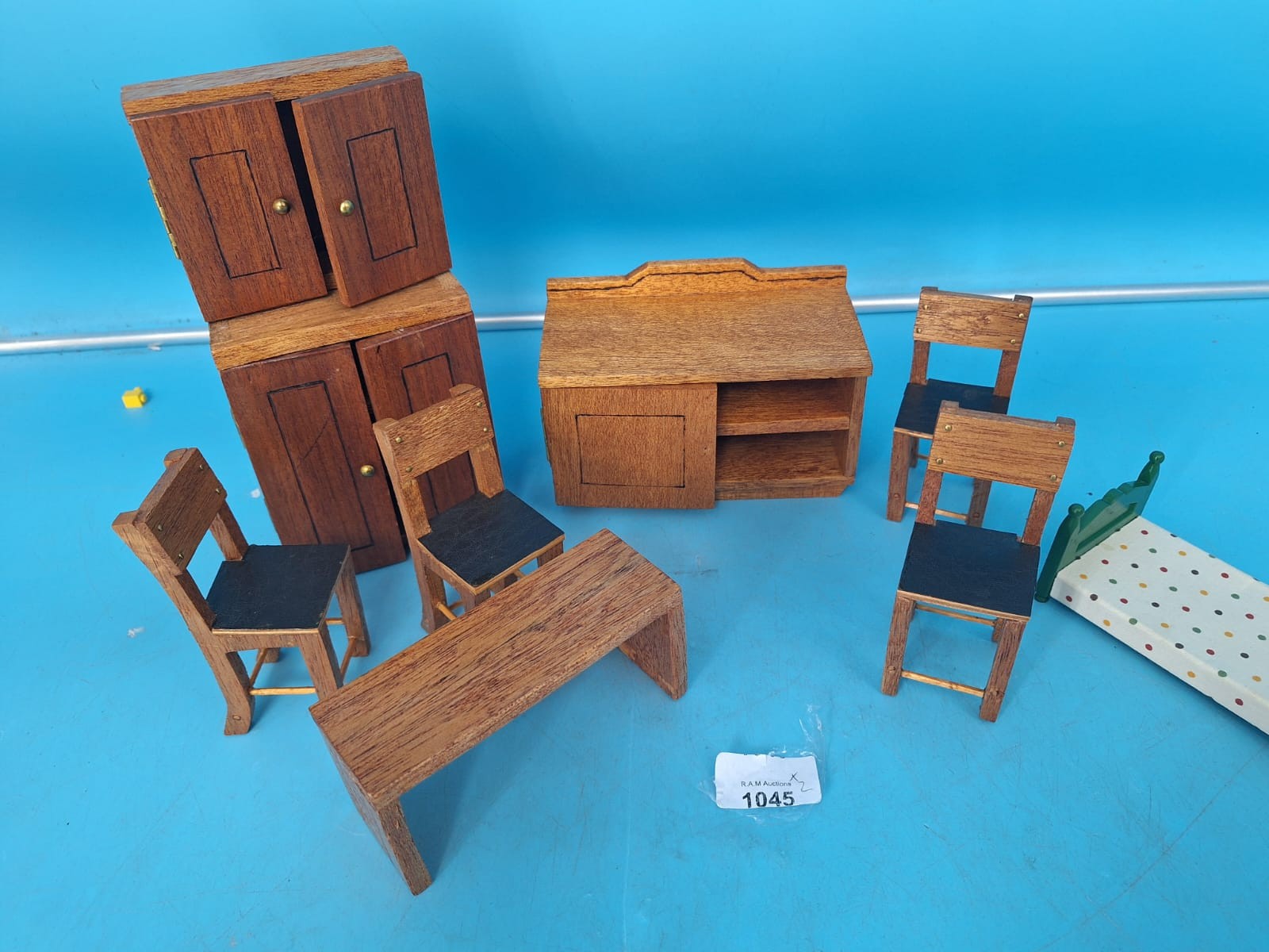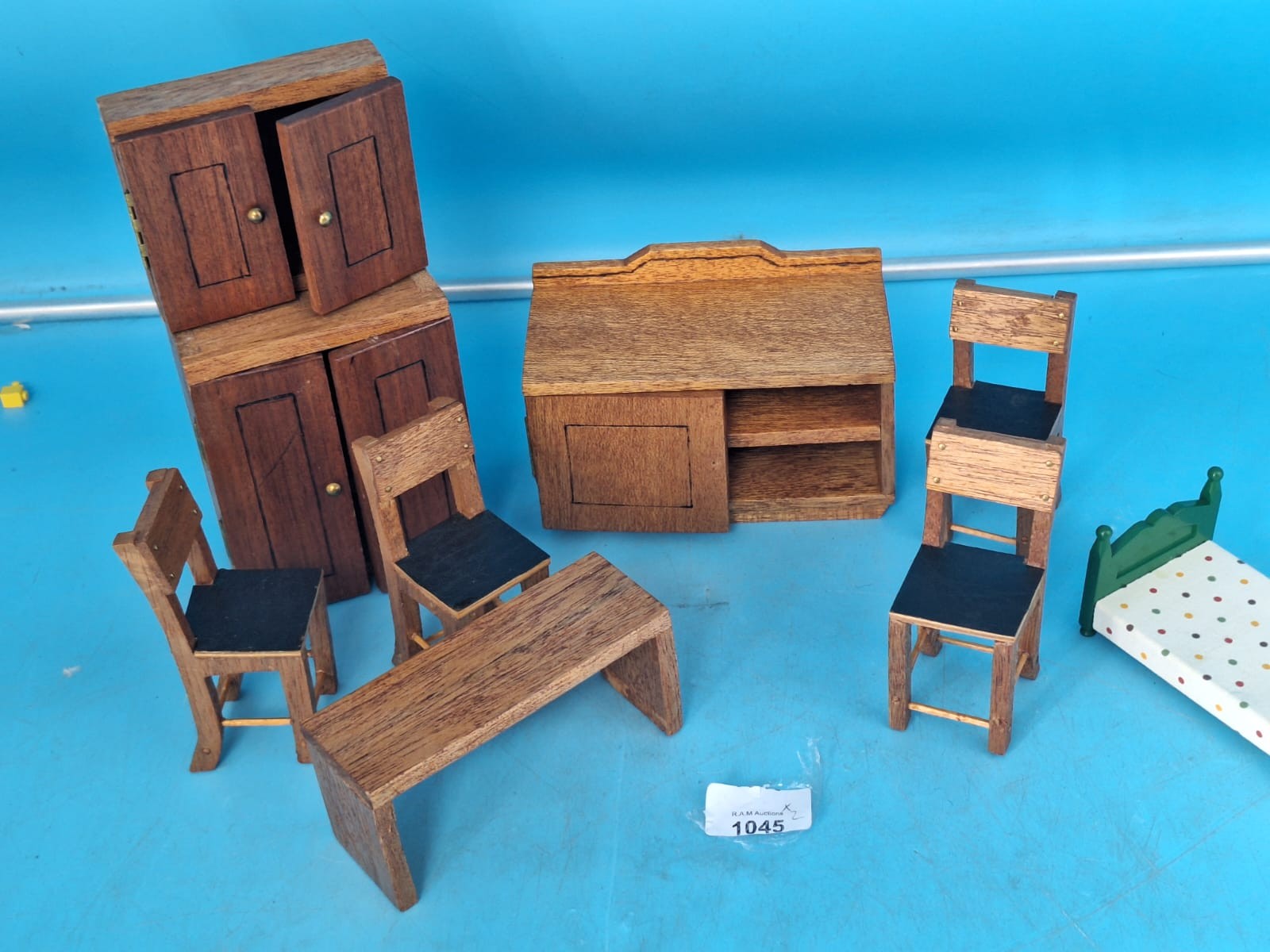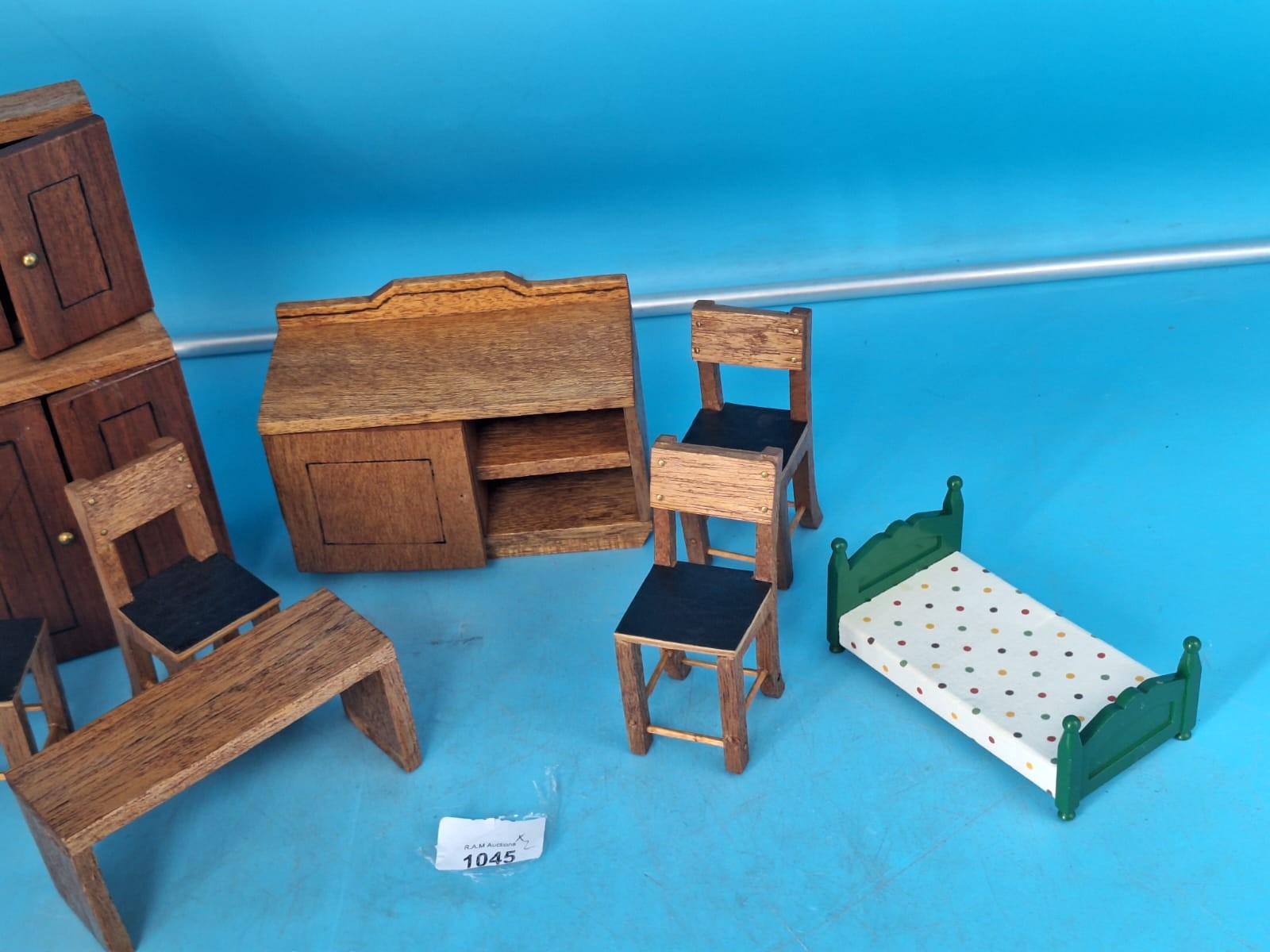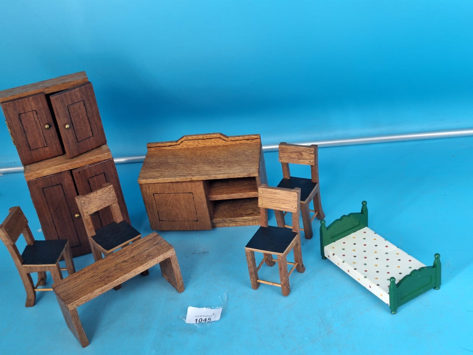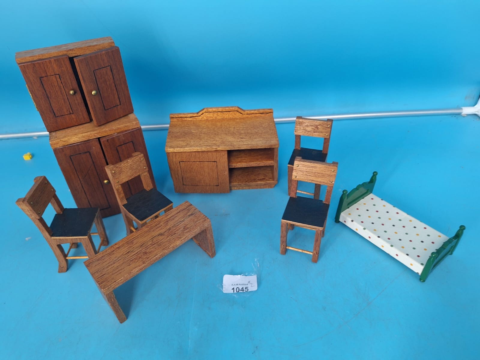 A set of miniature wooden dollhouse furniture including cabinets, a sideboard, a table, chairs, and a bed.