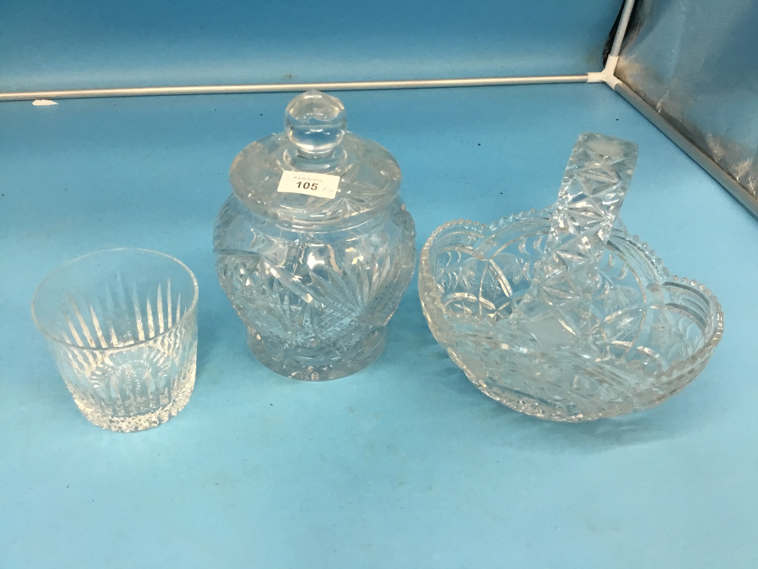Clear glass jar with domed lid, cylindrical tumbler, and shallow bowl with handle, all featuring intricate cut-glass patterns.