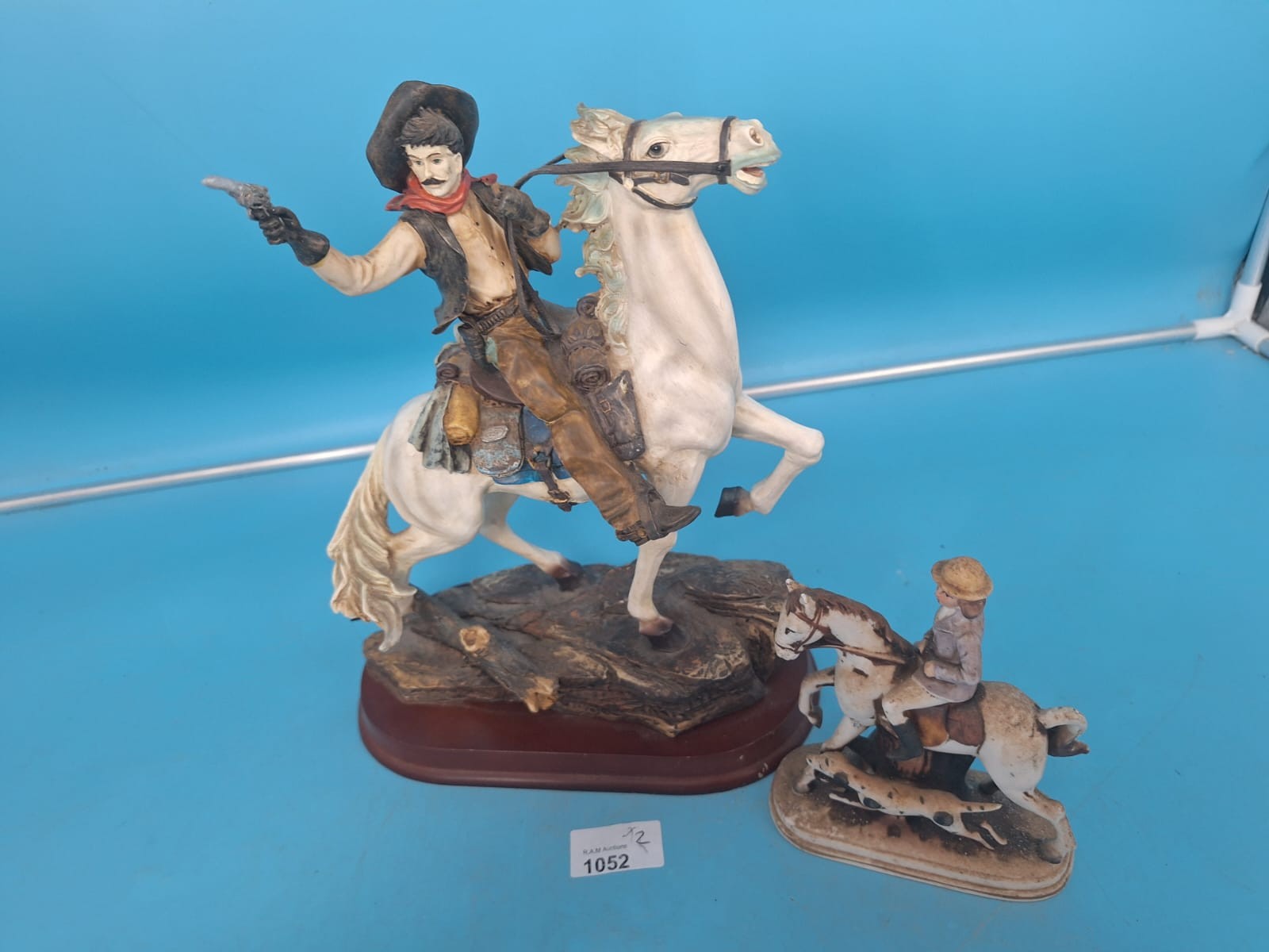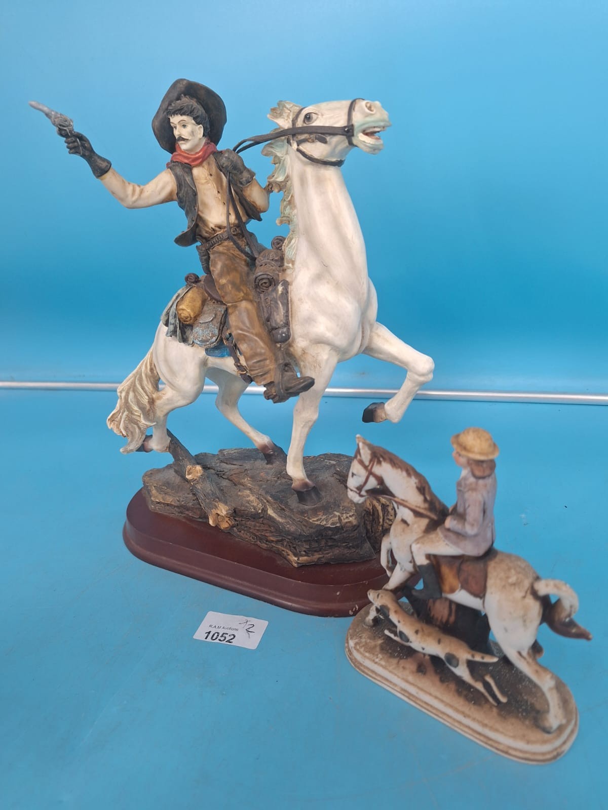 Two resin figurines depict cowboys on horseback, one rearing with a pistol, the other in a less dynamic pose.