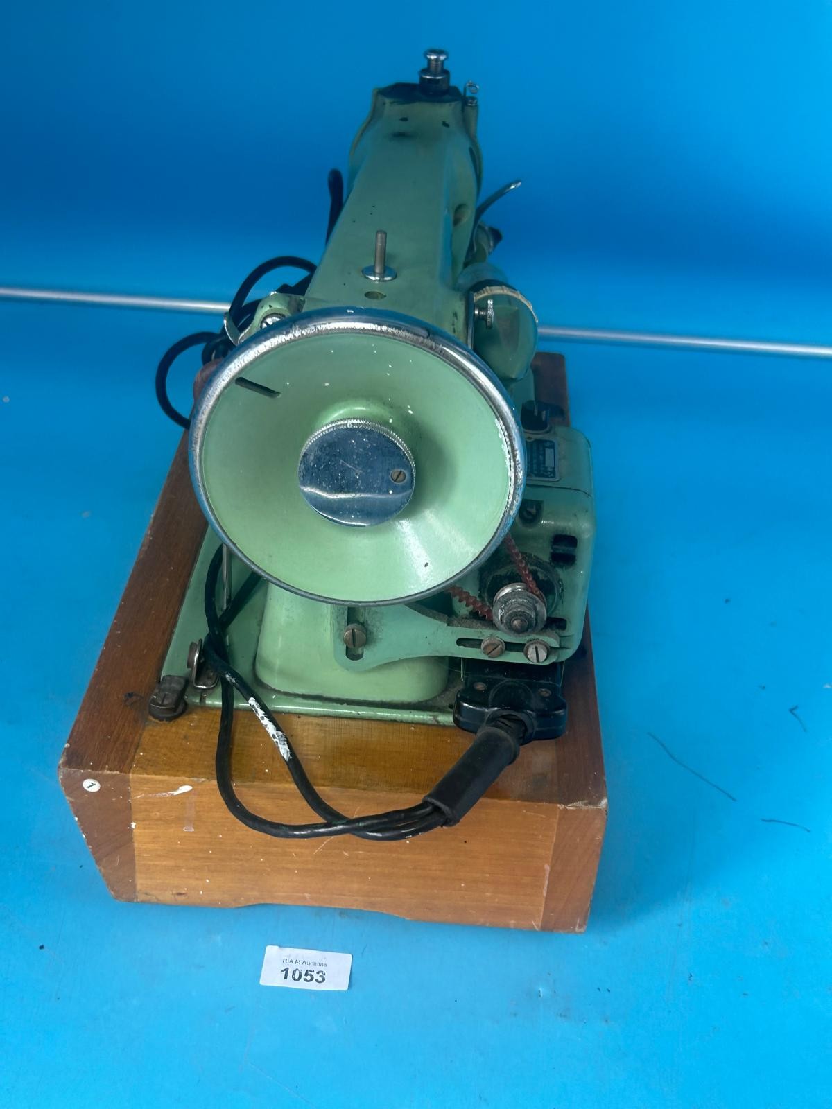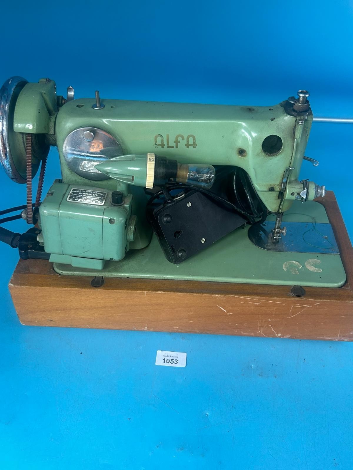 Pale green vintage Alfa sewing machine with a light bulb, hand wheel, and electrical cords, mounted on a light brown wooden base.