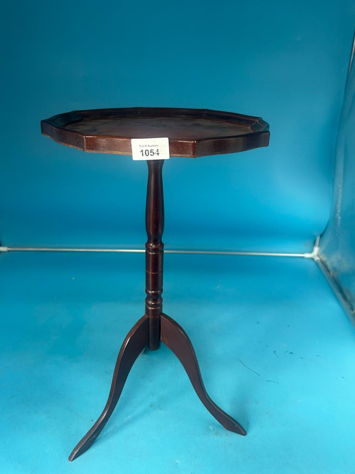 Small, dark brown wooden table with an octagonal top and a three-legged base.