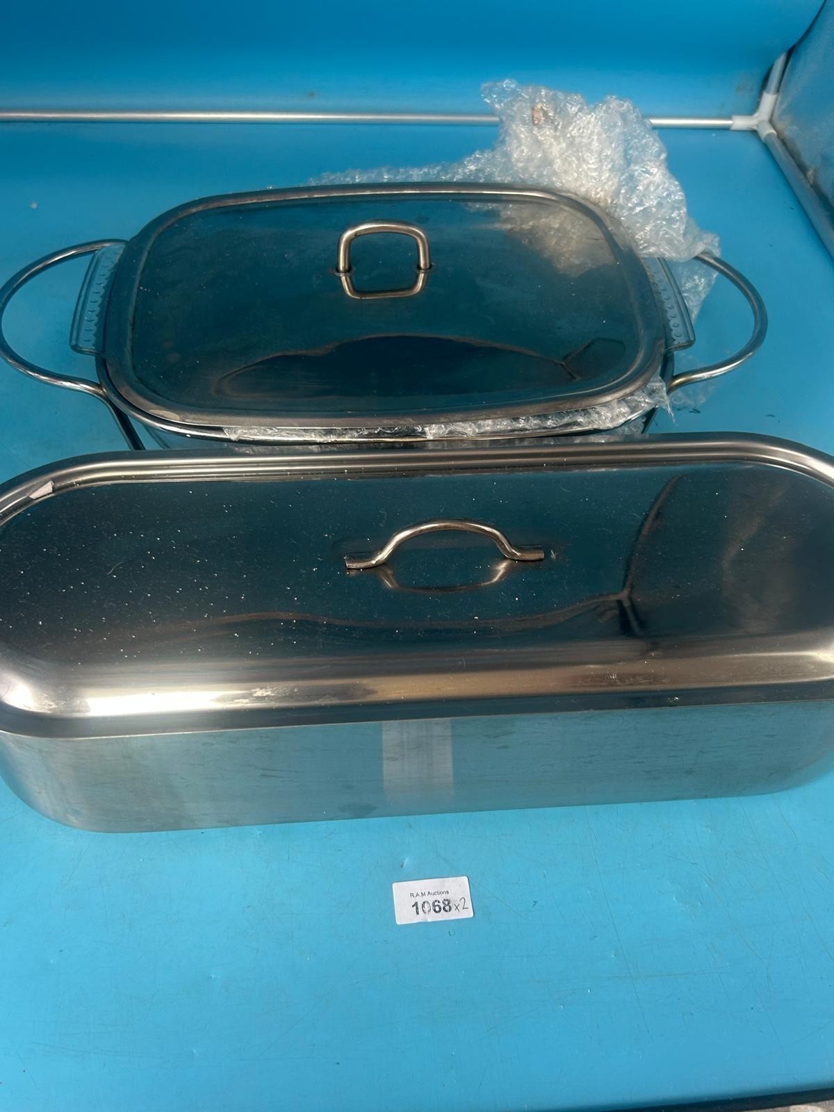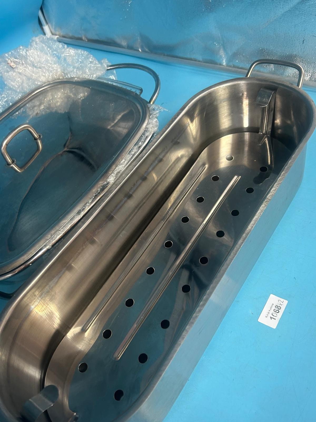 Oval and rectangular stainless steel roasting pans with arched lid handles and a perforated insert in the smaller pan.