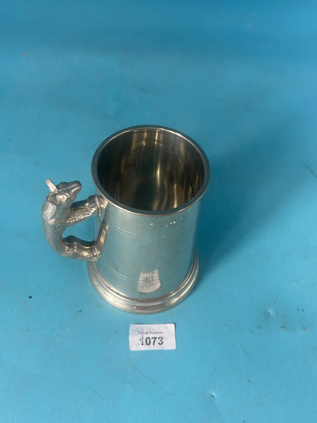 Cylindrical silver-toned metal tankard with a horse head handle and engraved “1812”.