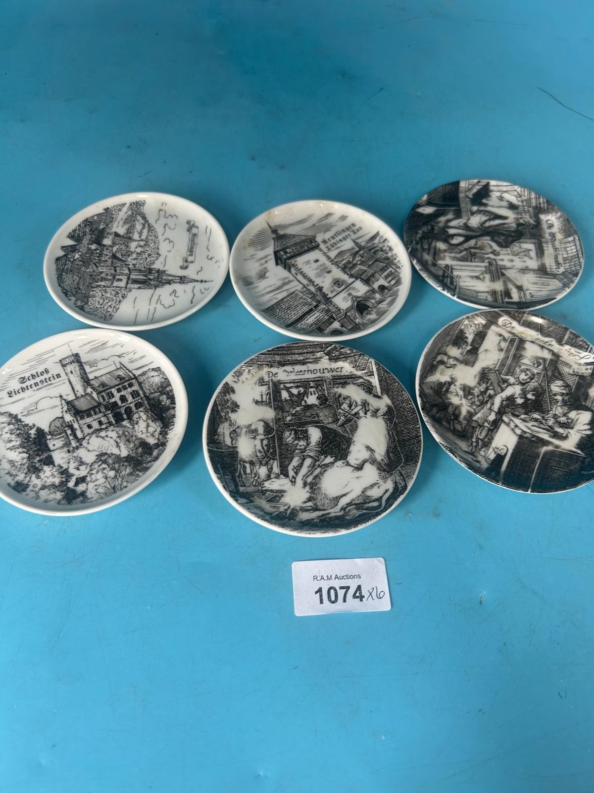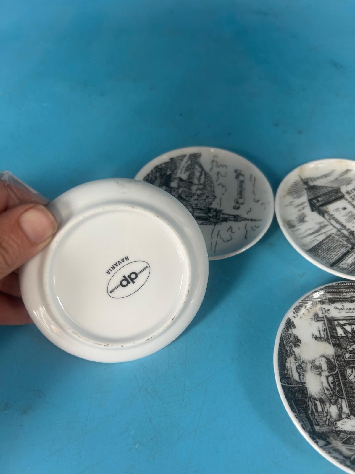 Porcelain coasters featuring monochrome architectural illustrations and text.