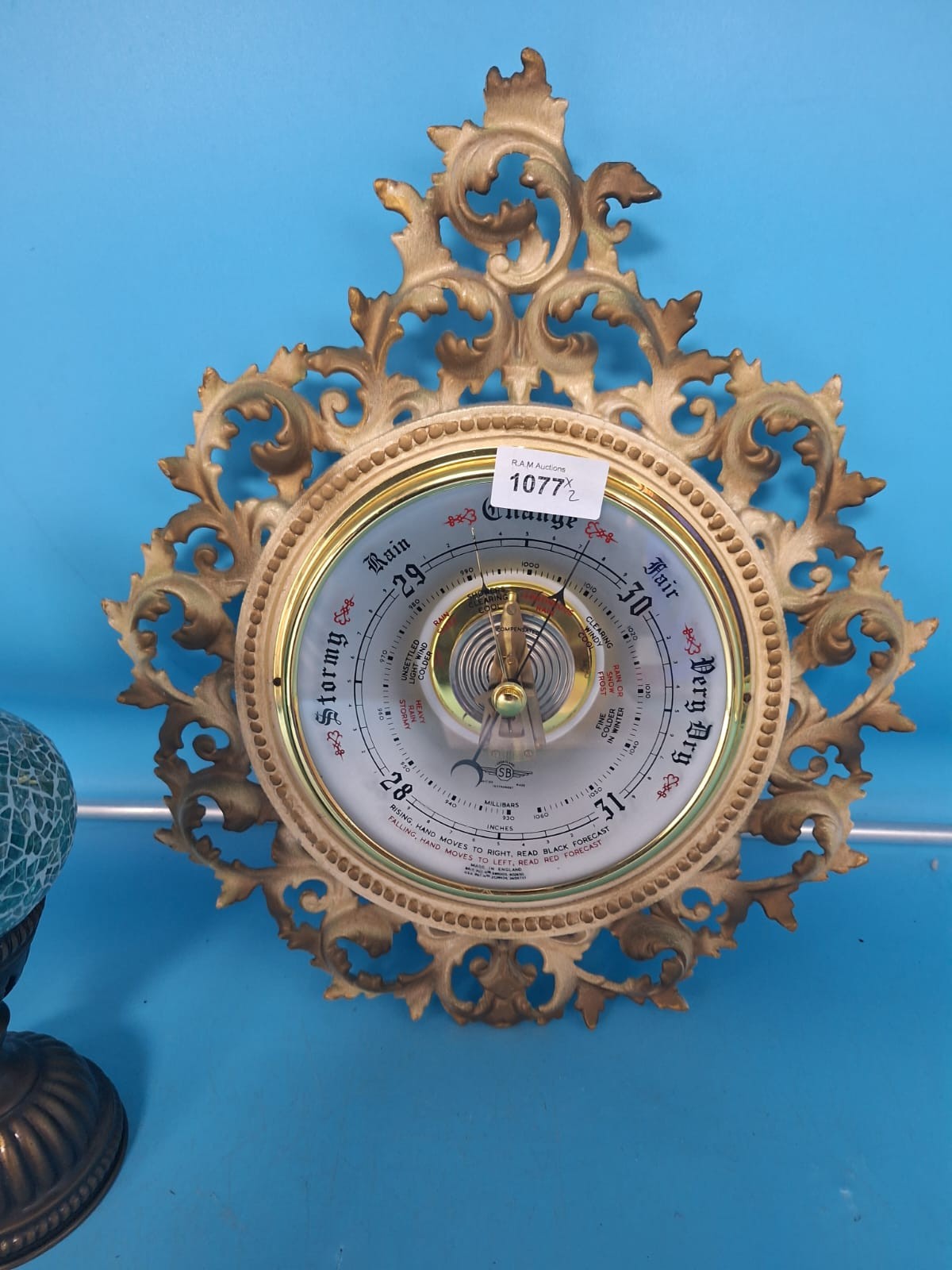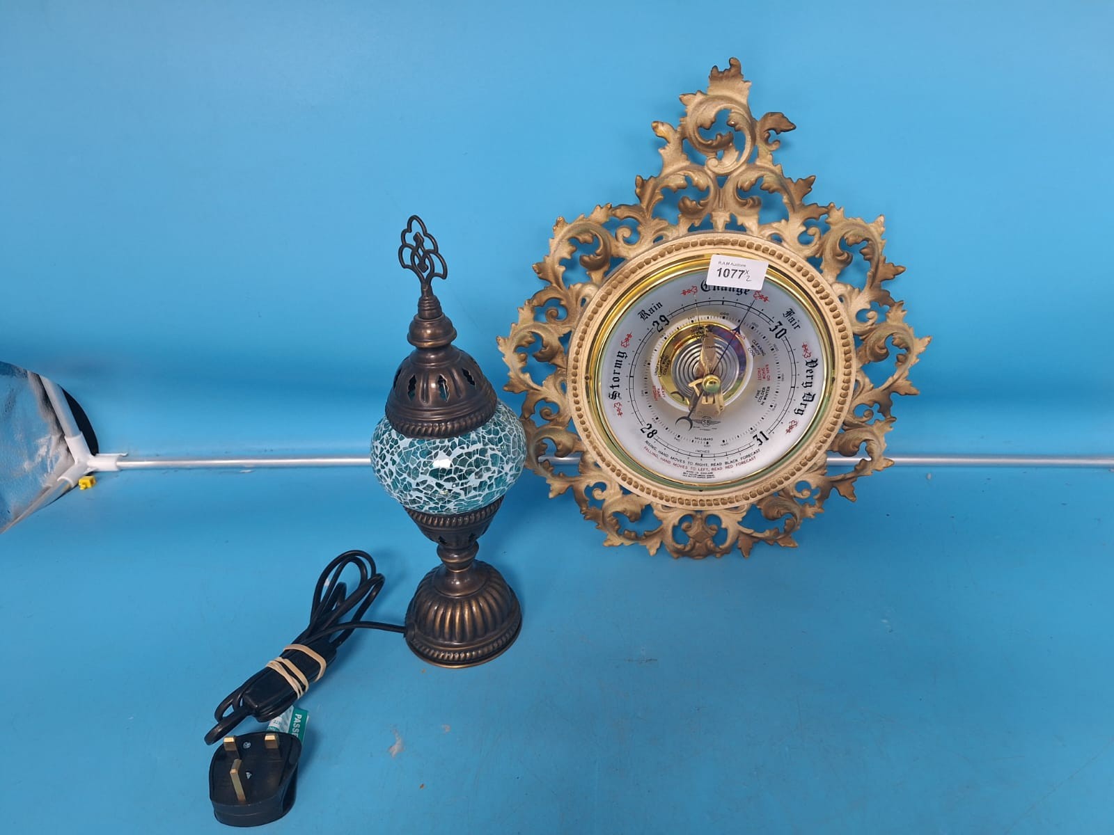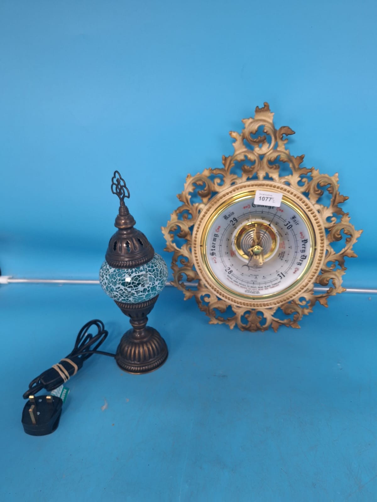 An ornate analog barometer with a rococo-style frame is paired with a mosaic glass table lamp.
