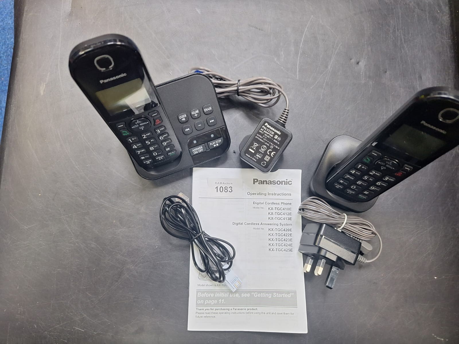 Black Panasonic digital cordless phones, model KX-TG4130, with base units, power adapters, and instruction manual.