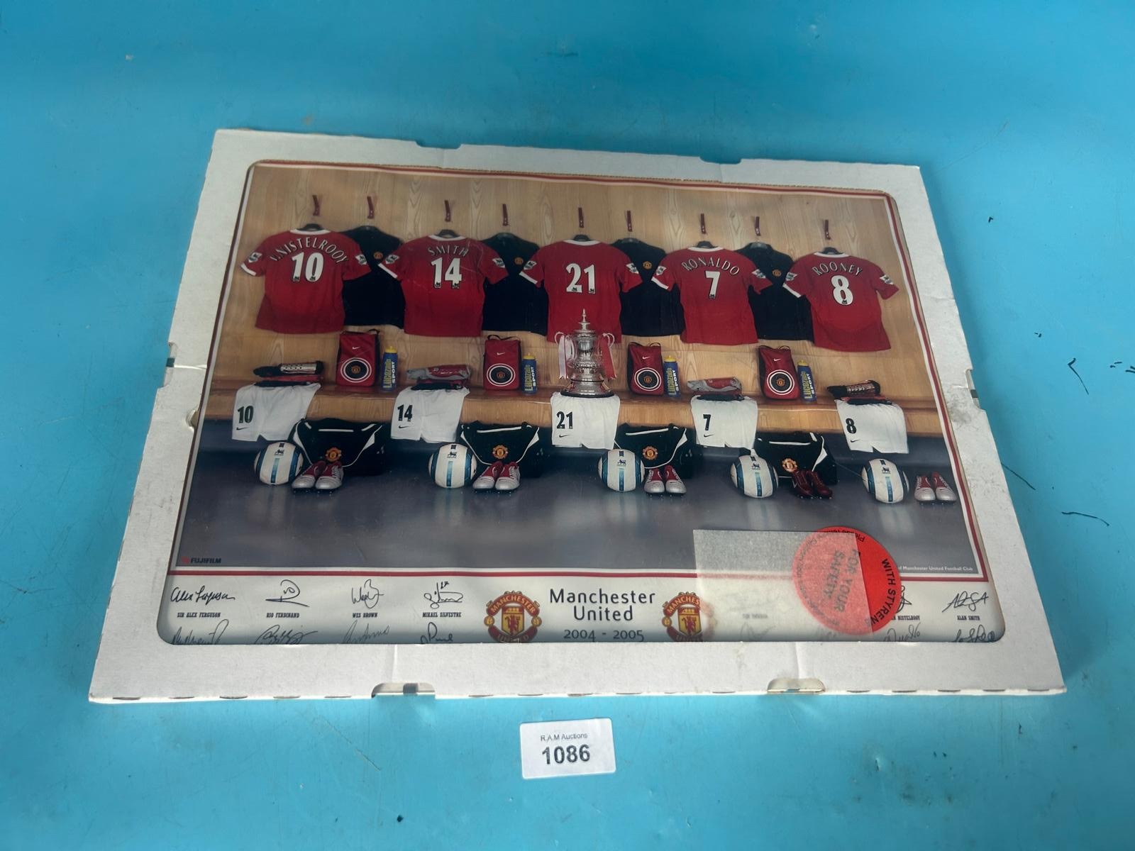 Framed photographic print of the Manchester United 2004-05 dressing room featuring signed jerseys and a trophy.