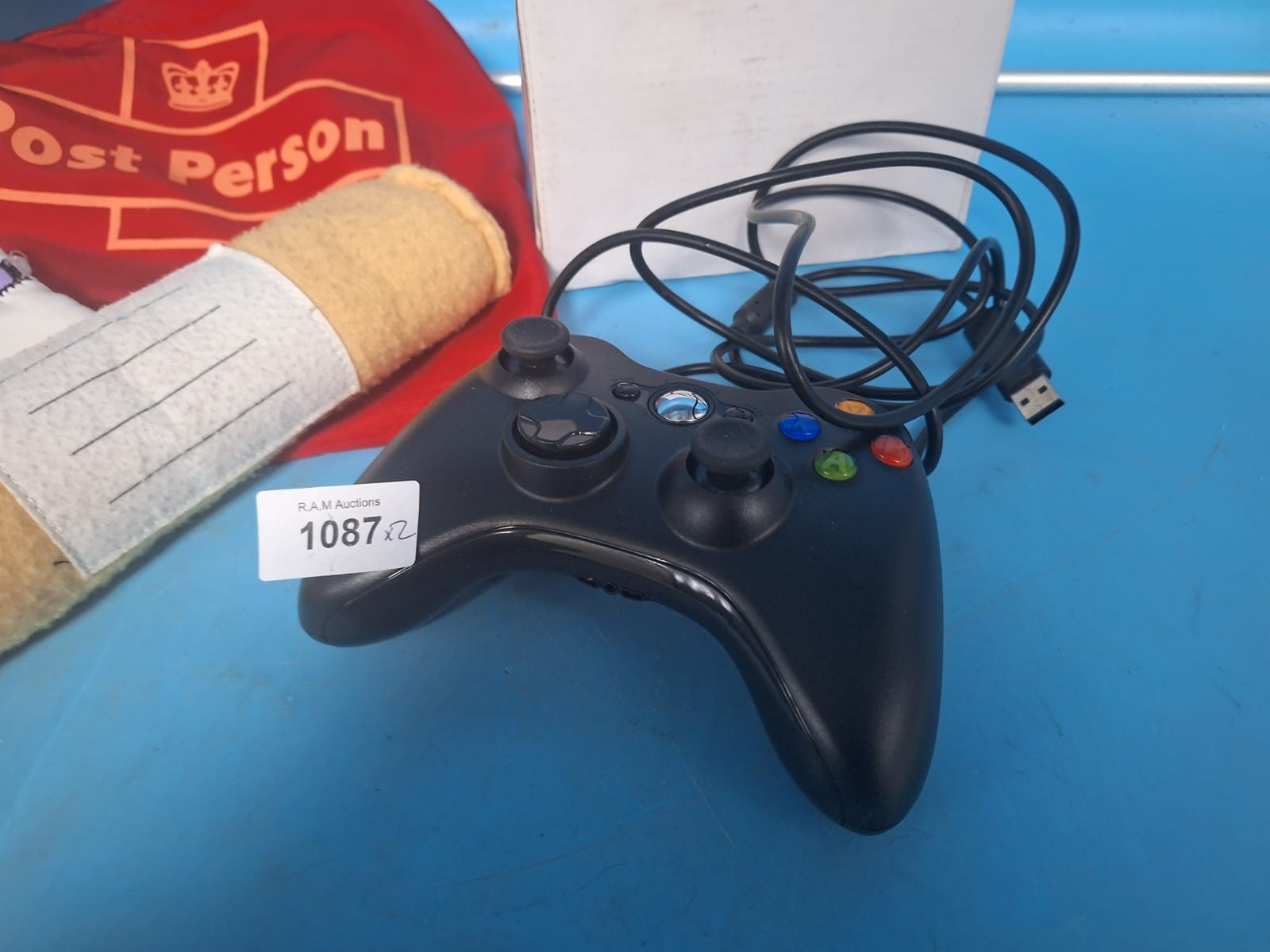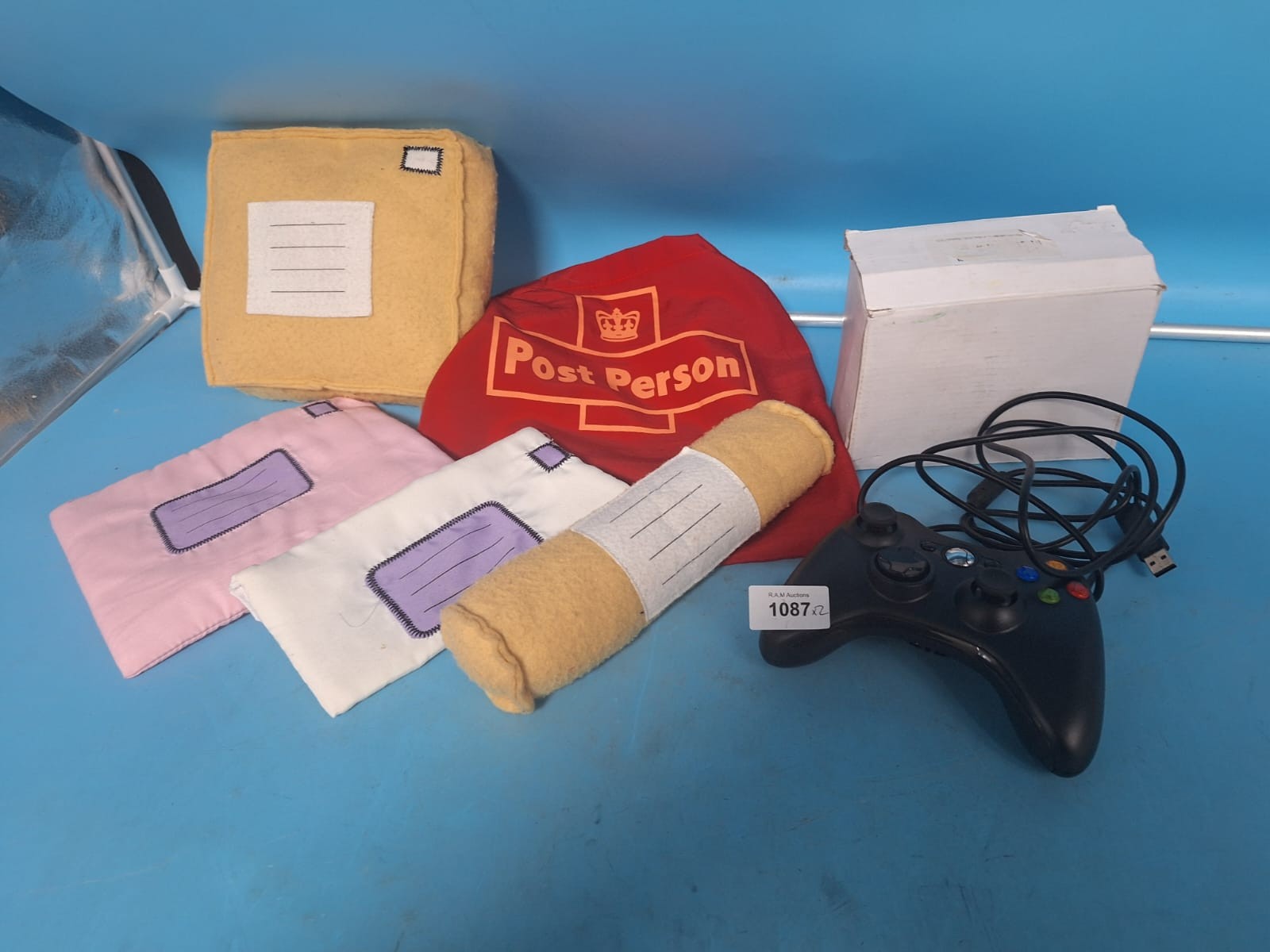 A collection of gaming accessories and postal-themed fabric items.