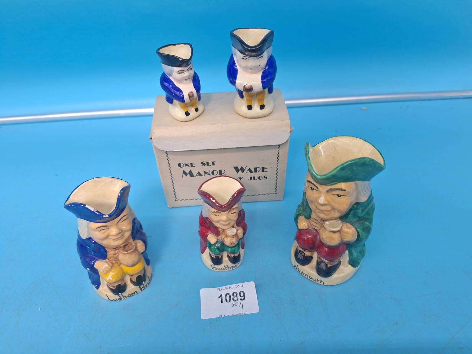 Miniature ceramic jugs depicting colonial figures with colored coats and hats, marked Lydham Binch, Southport, and Weymouth.