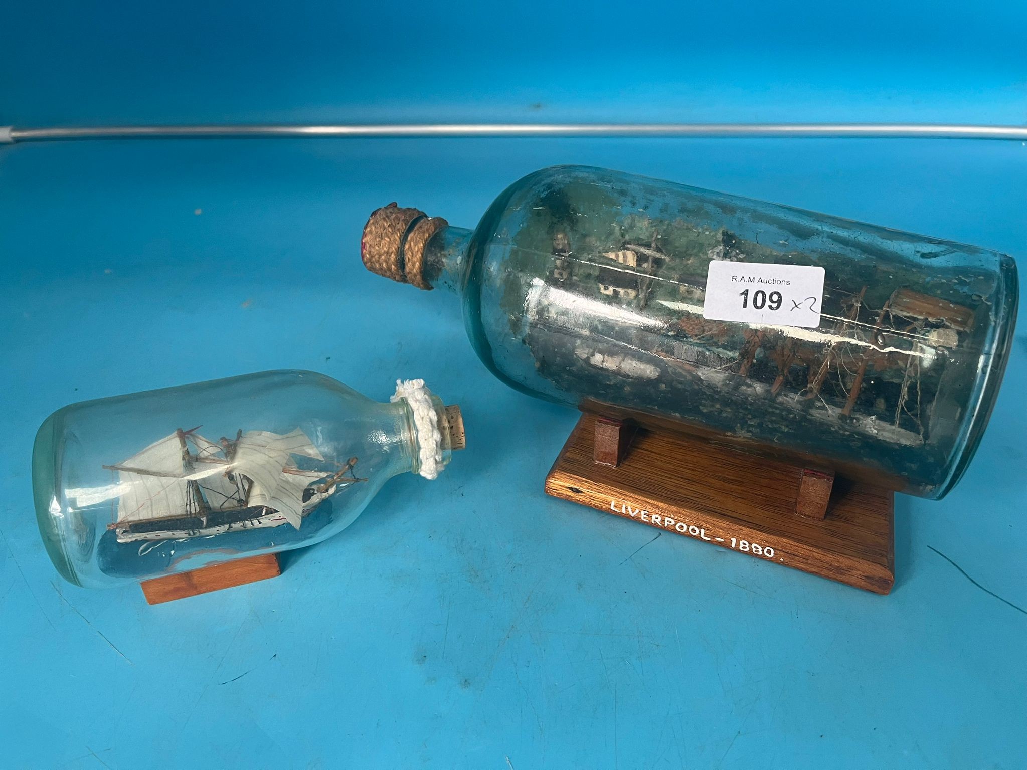 Two glass bottles, each containing a miniature ship, displayed on wooden stands.