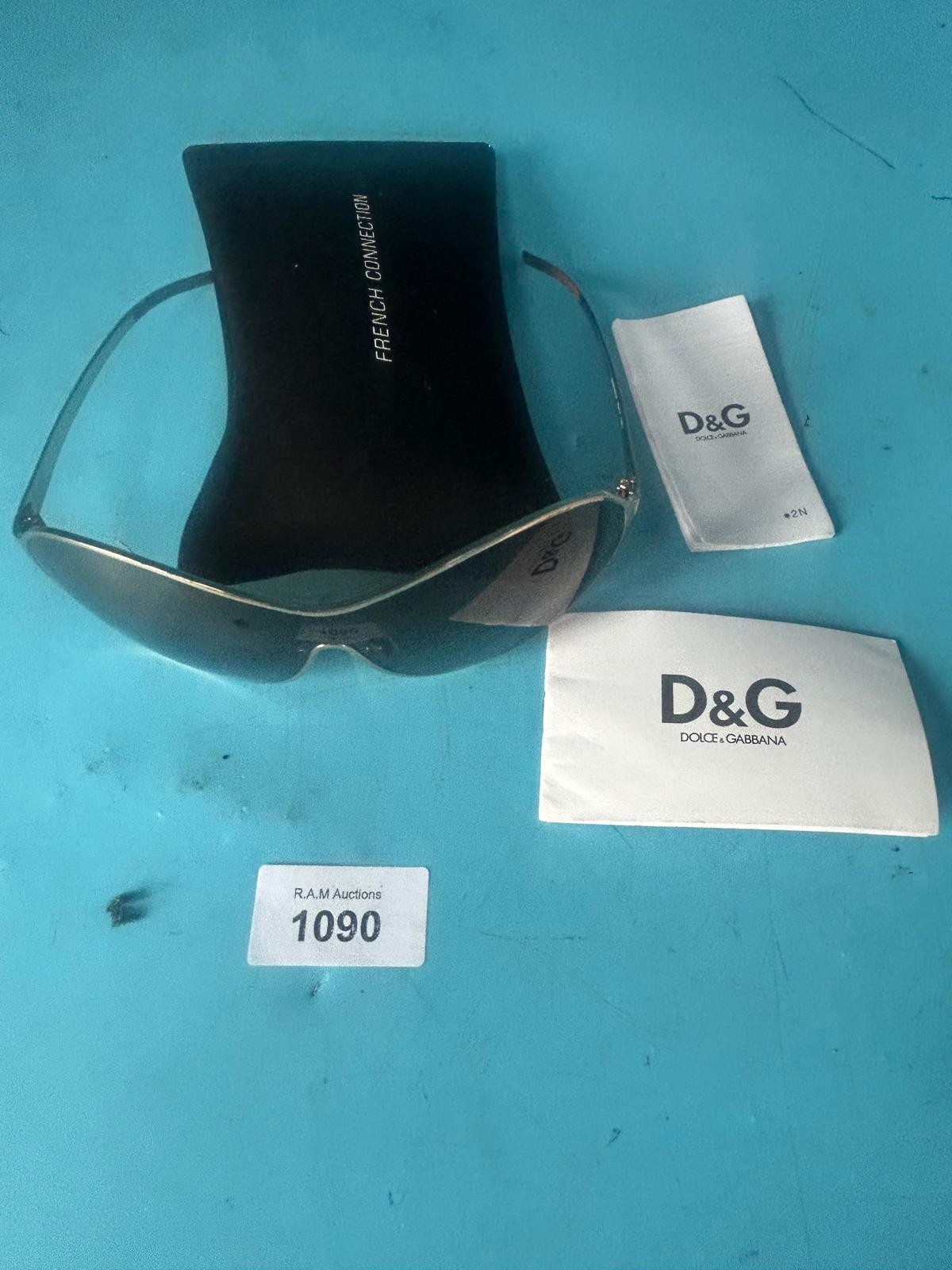 Wrap-around sunglasses with dark gray lenses and light-colored metal frames, accompanied by a black French Connection case and Dolce & Gabbana tags.