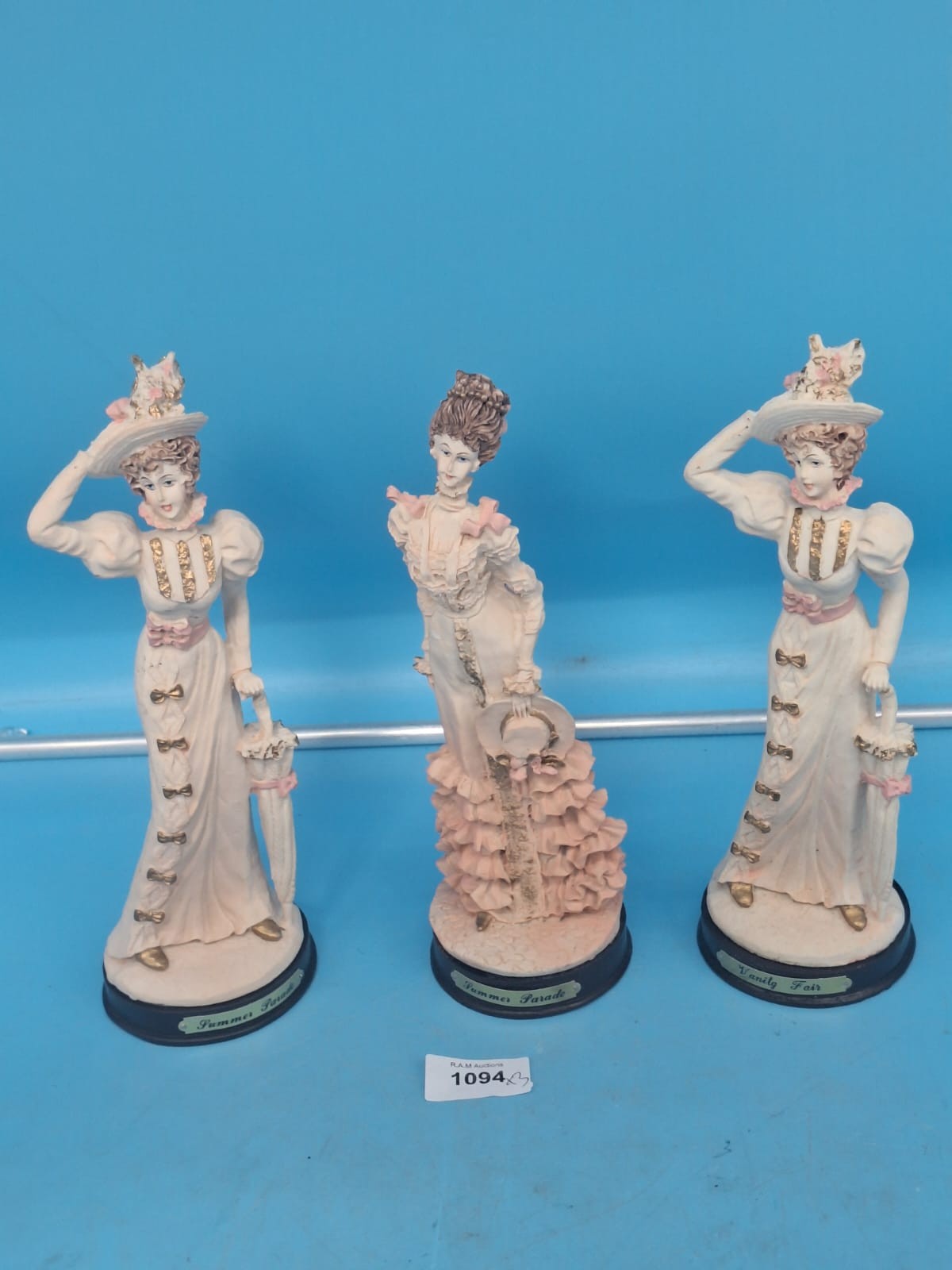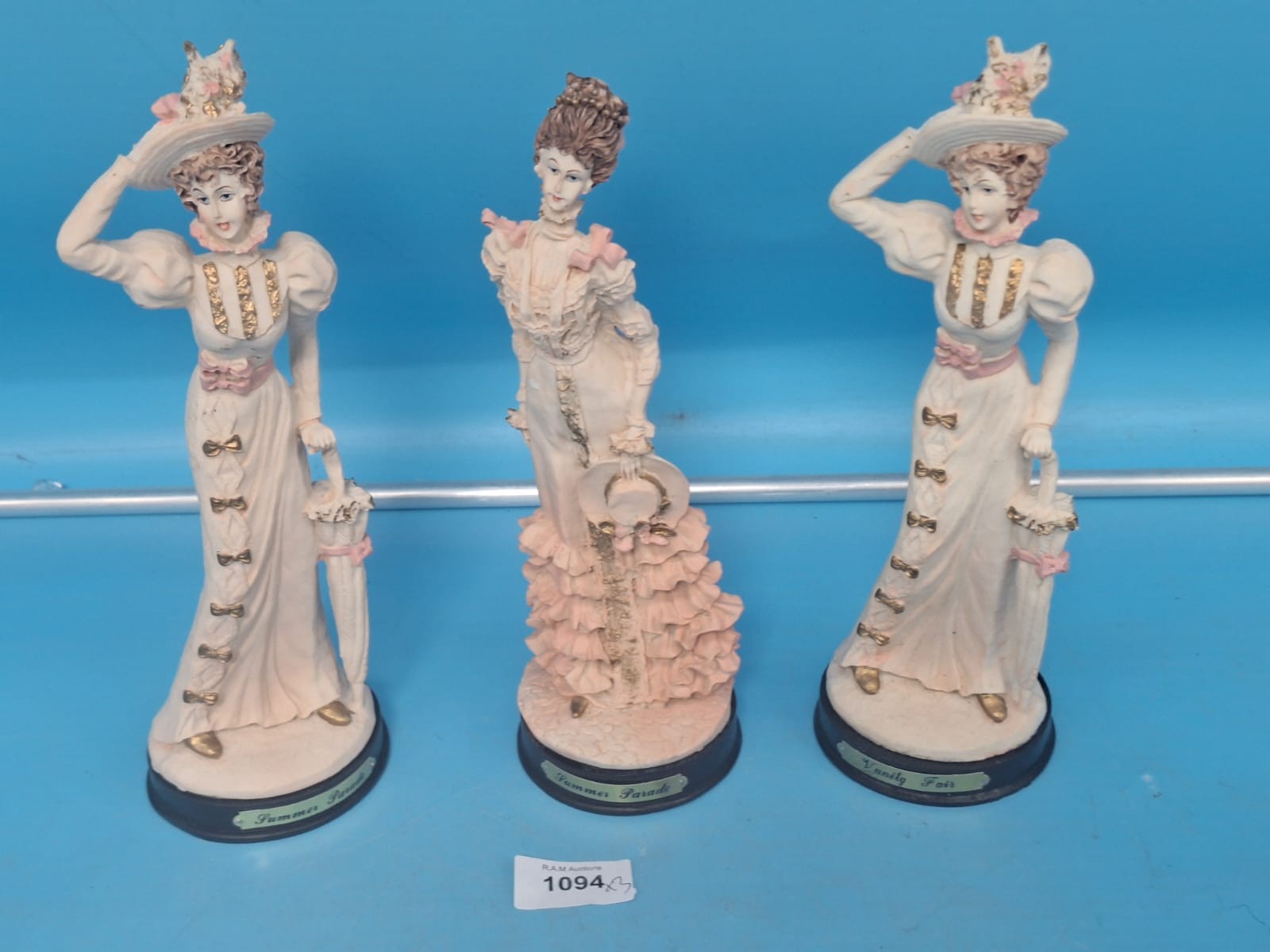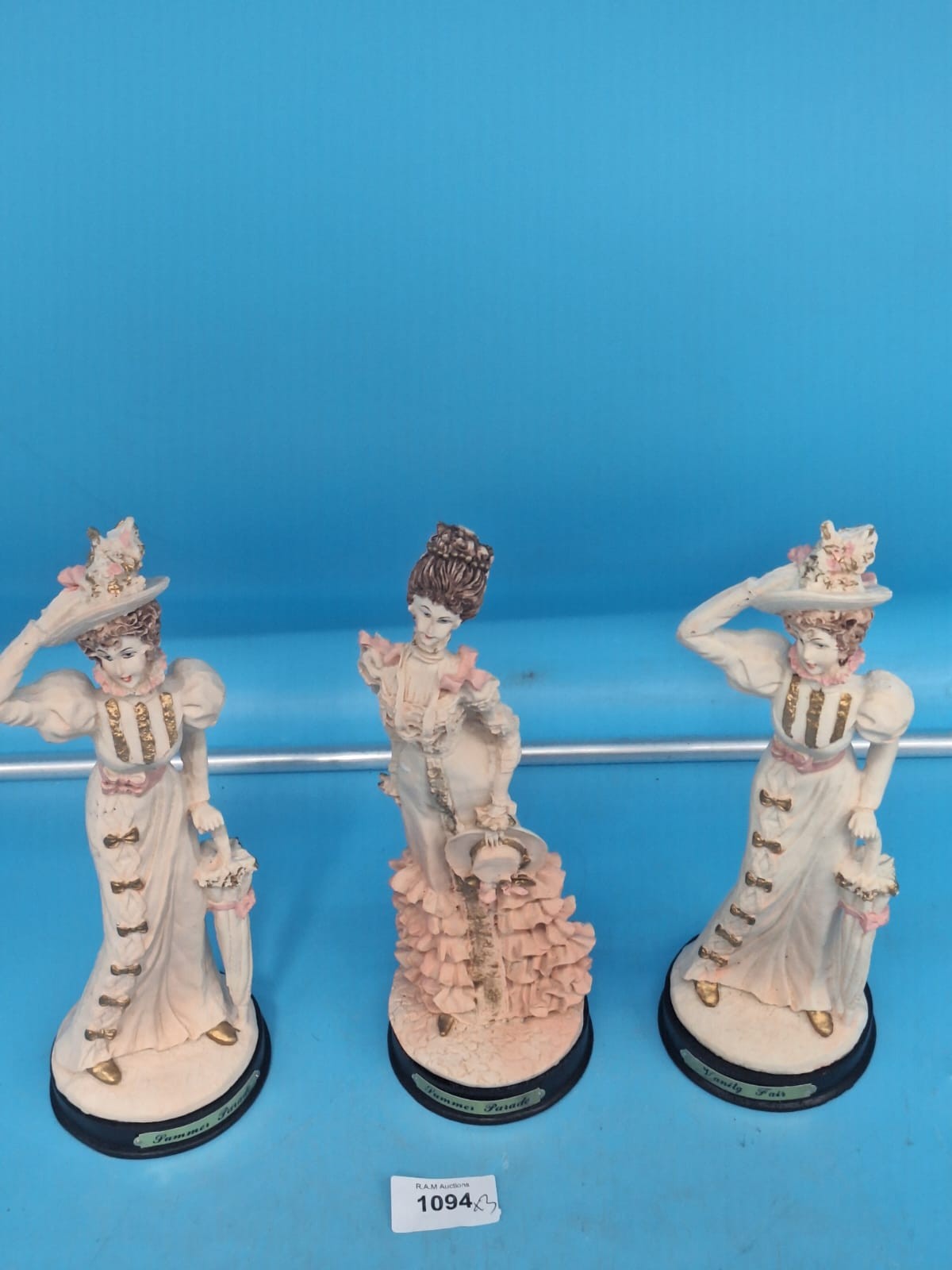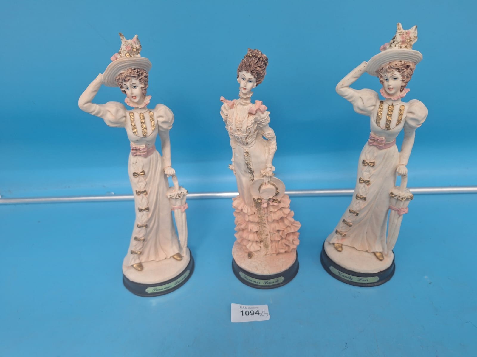 Figurines depict women in Edwardian-style dresses with pink accents and gold detailing, each on a black base inscribed “Donna Fair”.