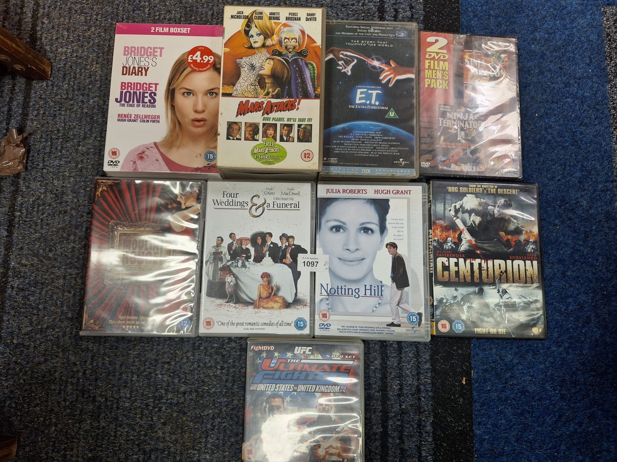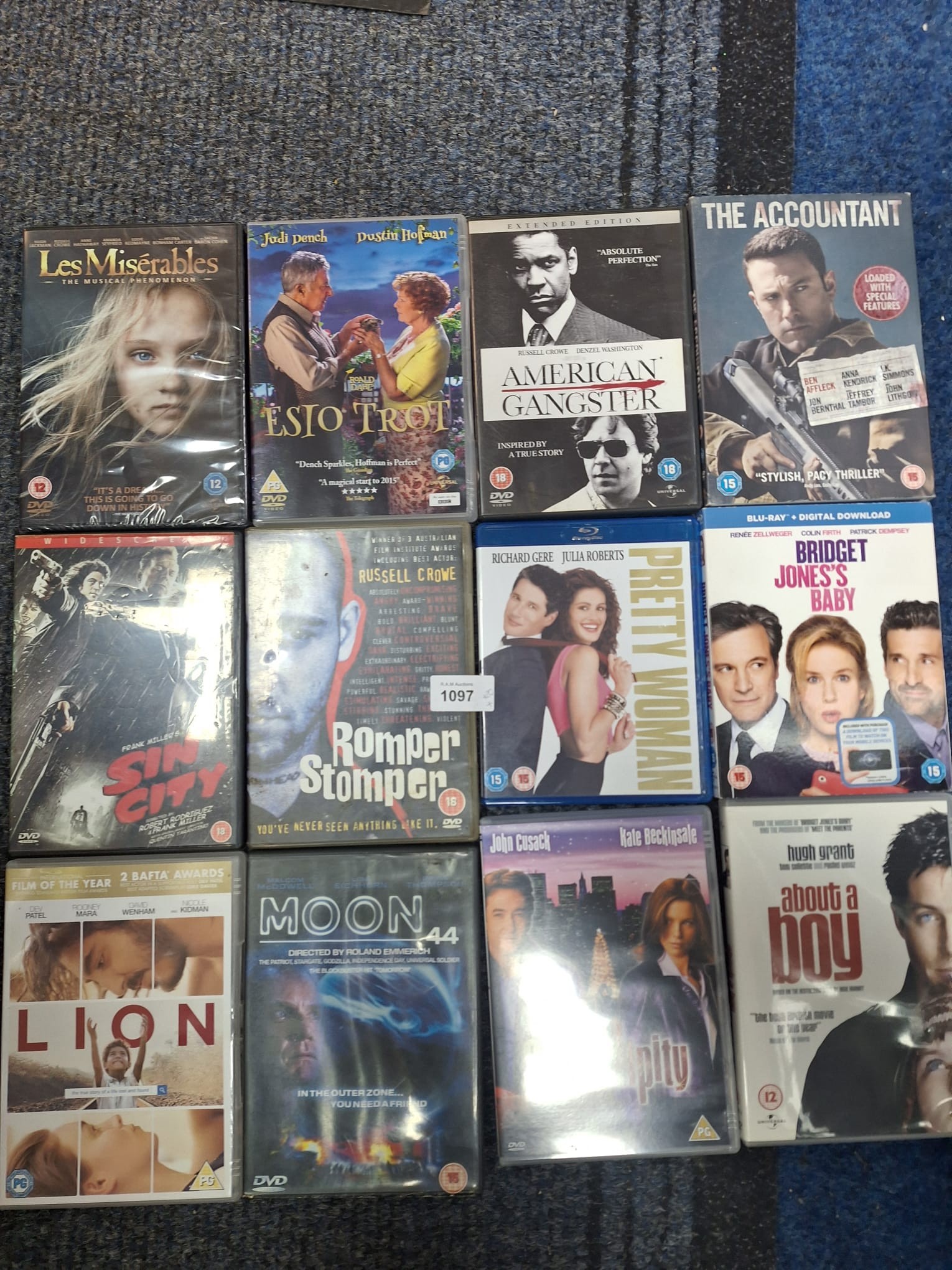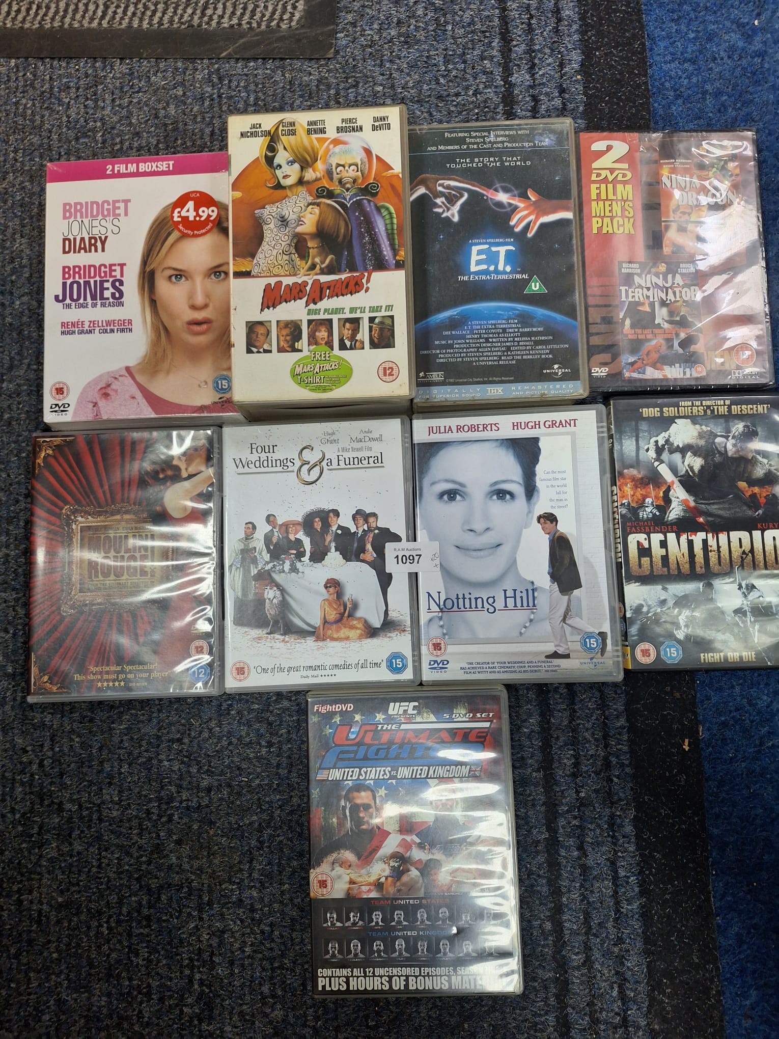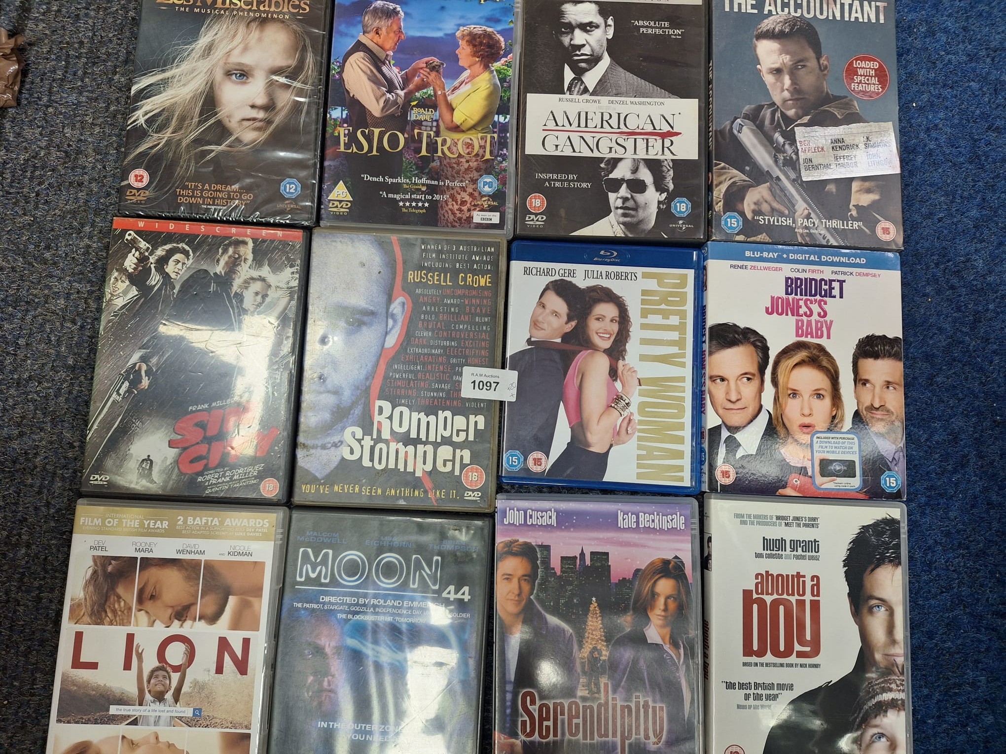 A collection of movie DVD and VHS cases featuring titles such as *Les Misérables*, *American Gangster*, *E.T. The Extra-Terrestrial*, and *Four Weddings and a Funeral*.