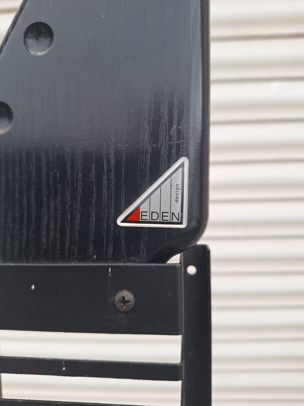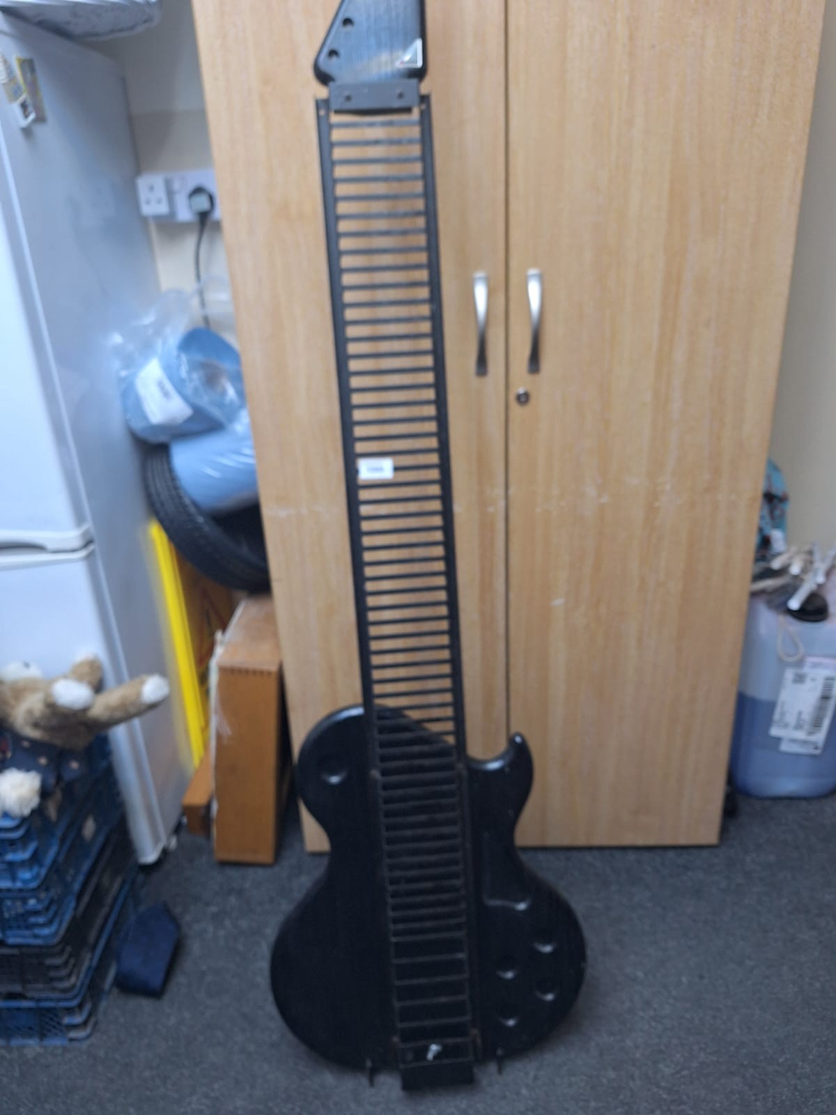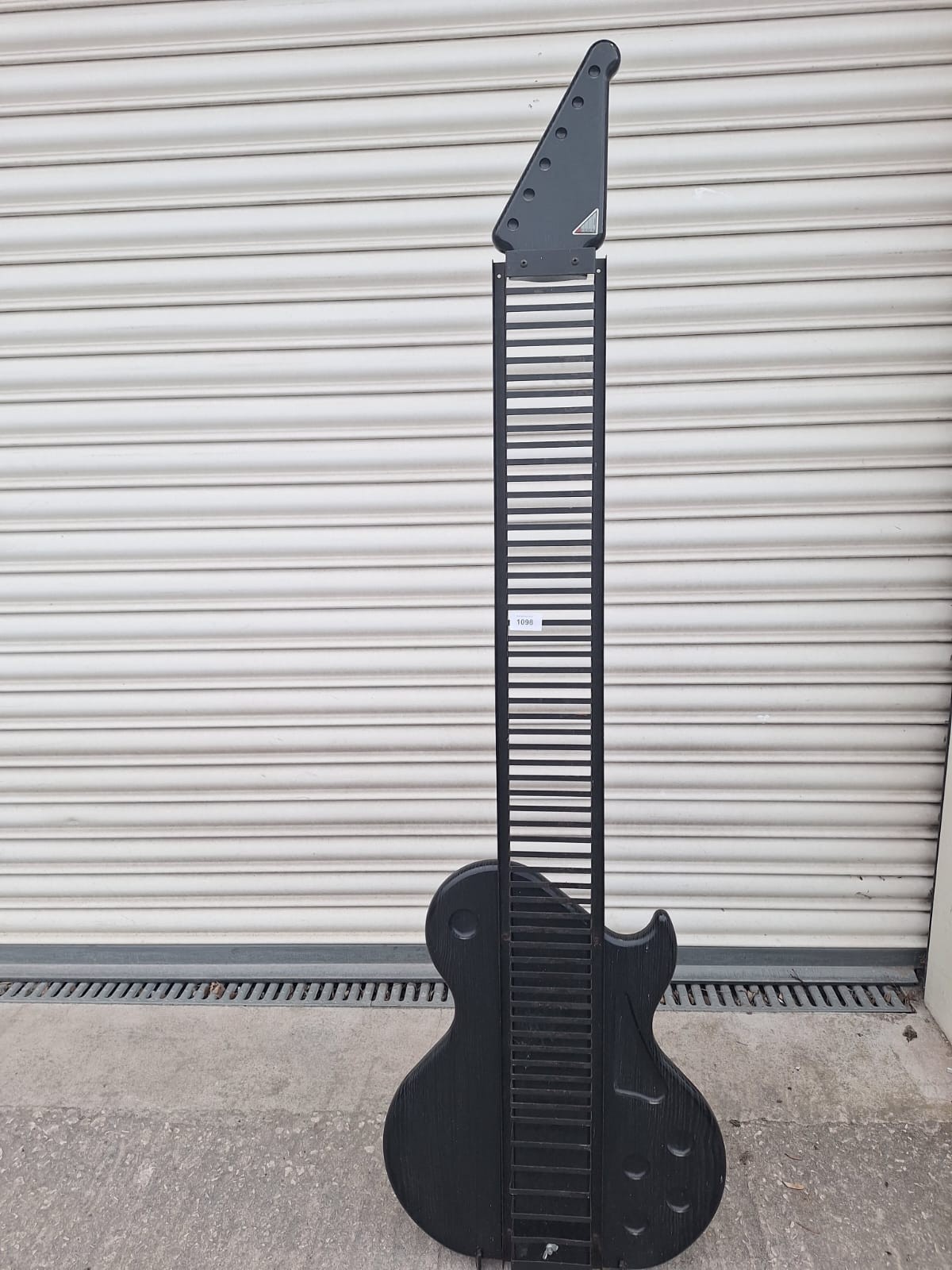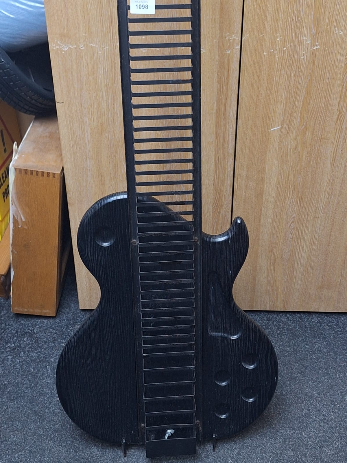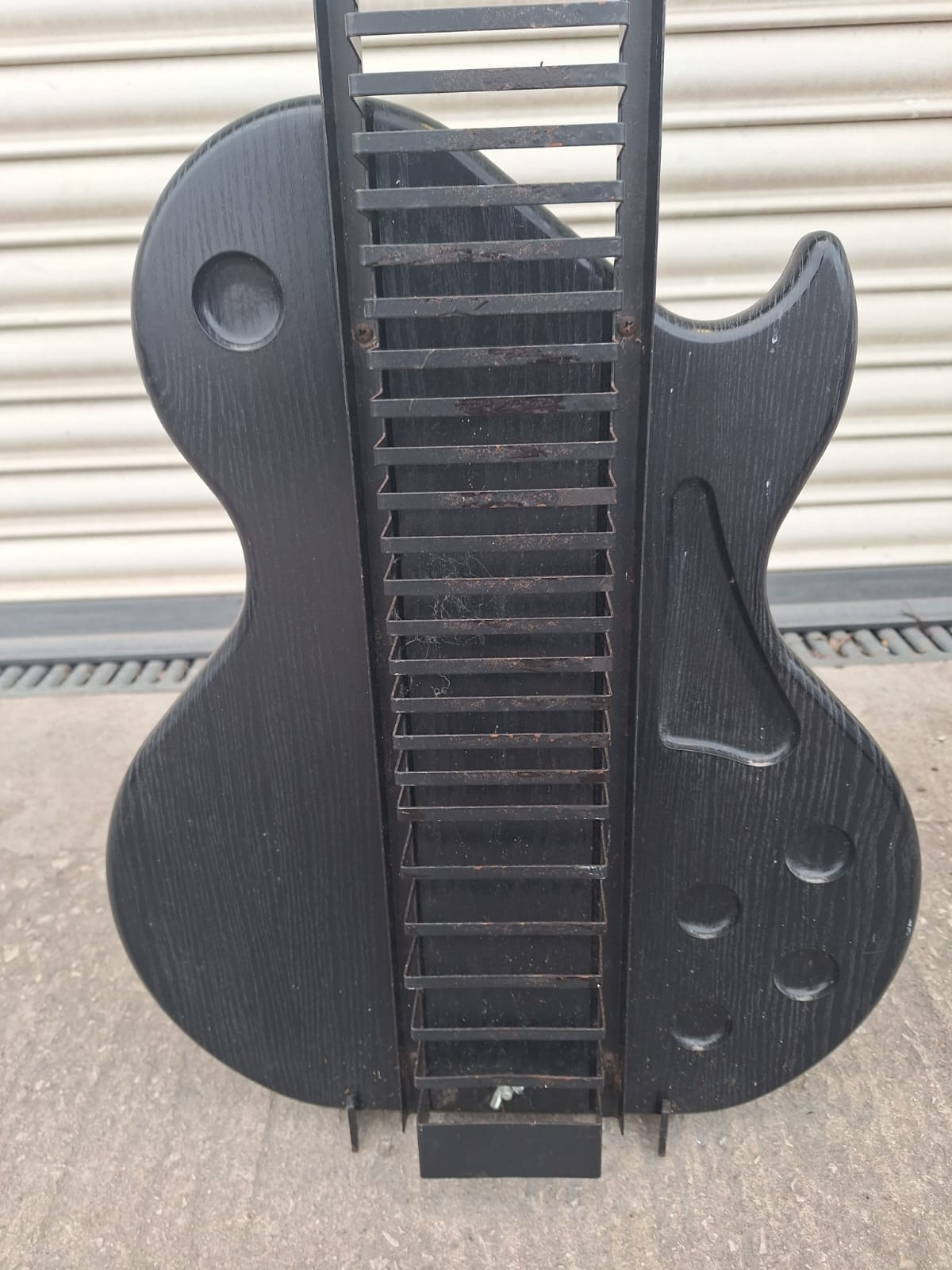 Black guitar-shaped CD/DVD rack with a metal rack attached to the center.