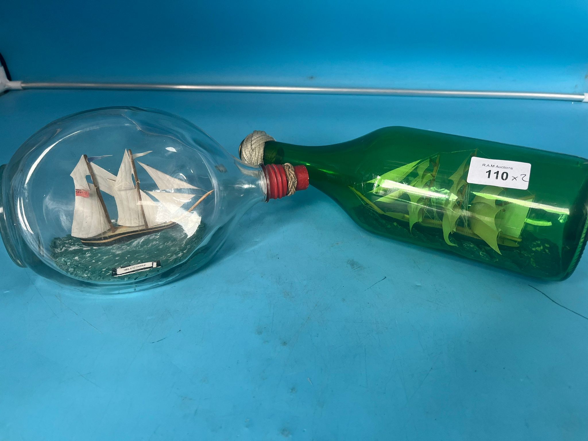 Glass bottles containing model sailing ships.