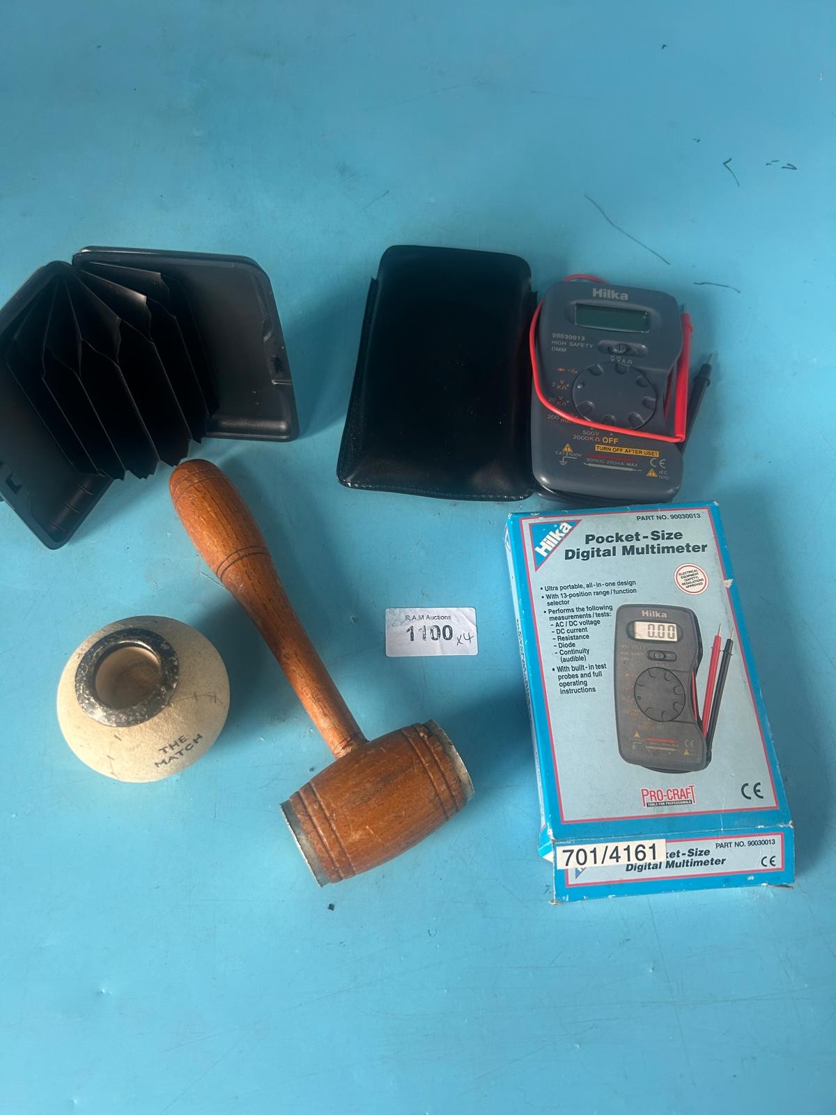 Black card holder, black leather-like case, gray Hilka digital multimeter, off-white match holder, and wooden mallet.