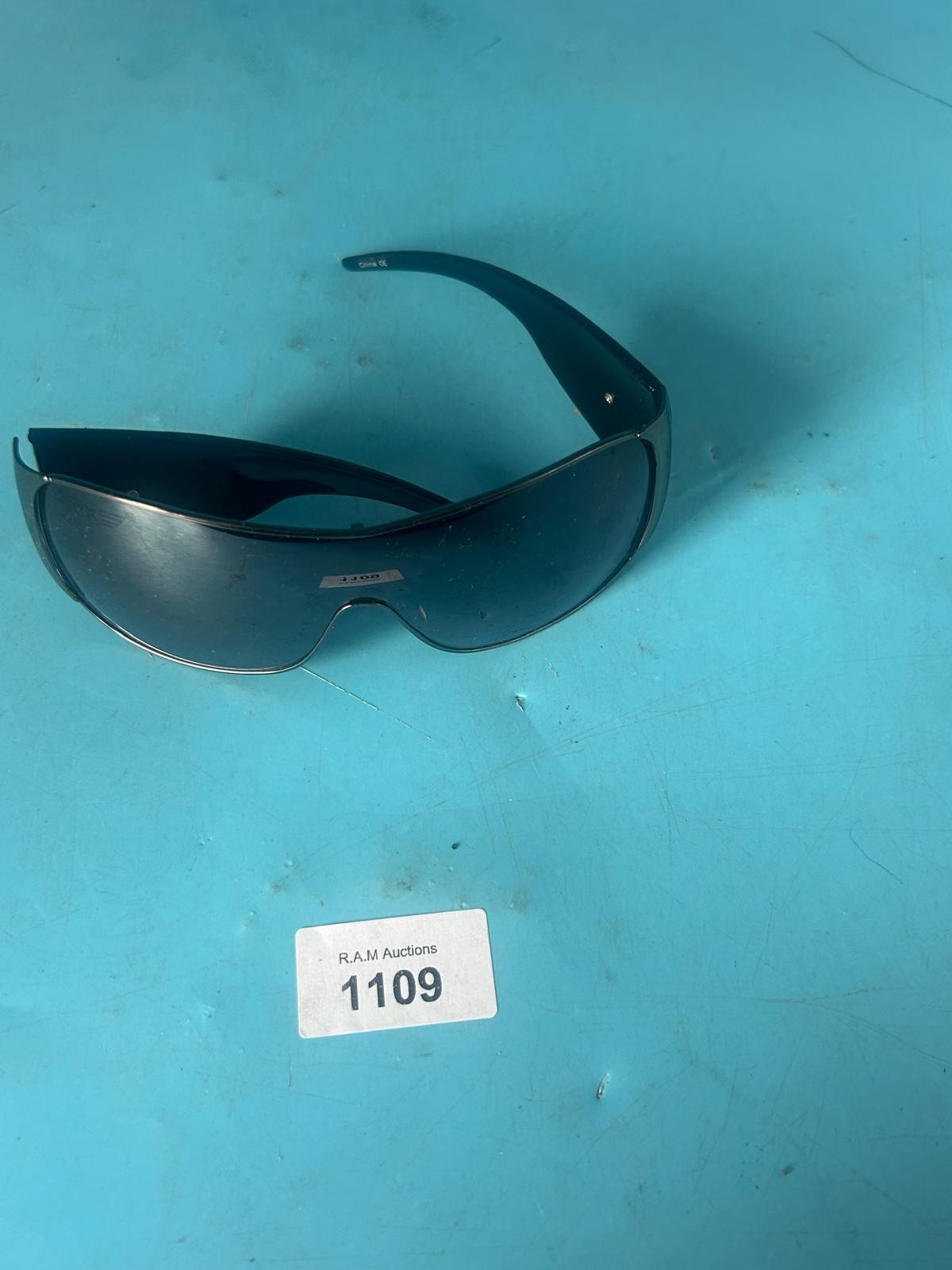 Shield-shaped sunglasses with dark gray lenses and black frames, featuring a silver winged logo on the arm.
