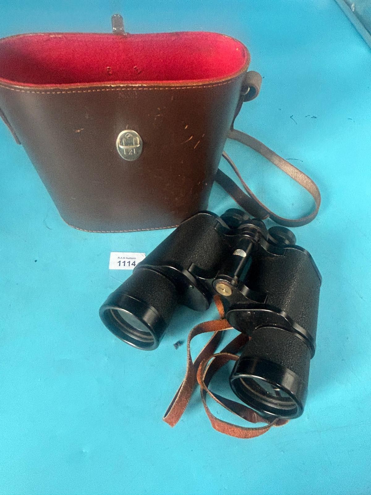 Black cylindrical binoculars with textured bodies in a cylindrical brown leather case with a pink interior and leather strap.