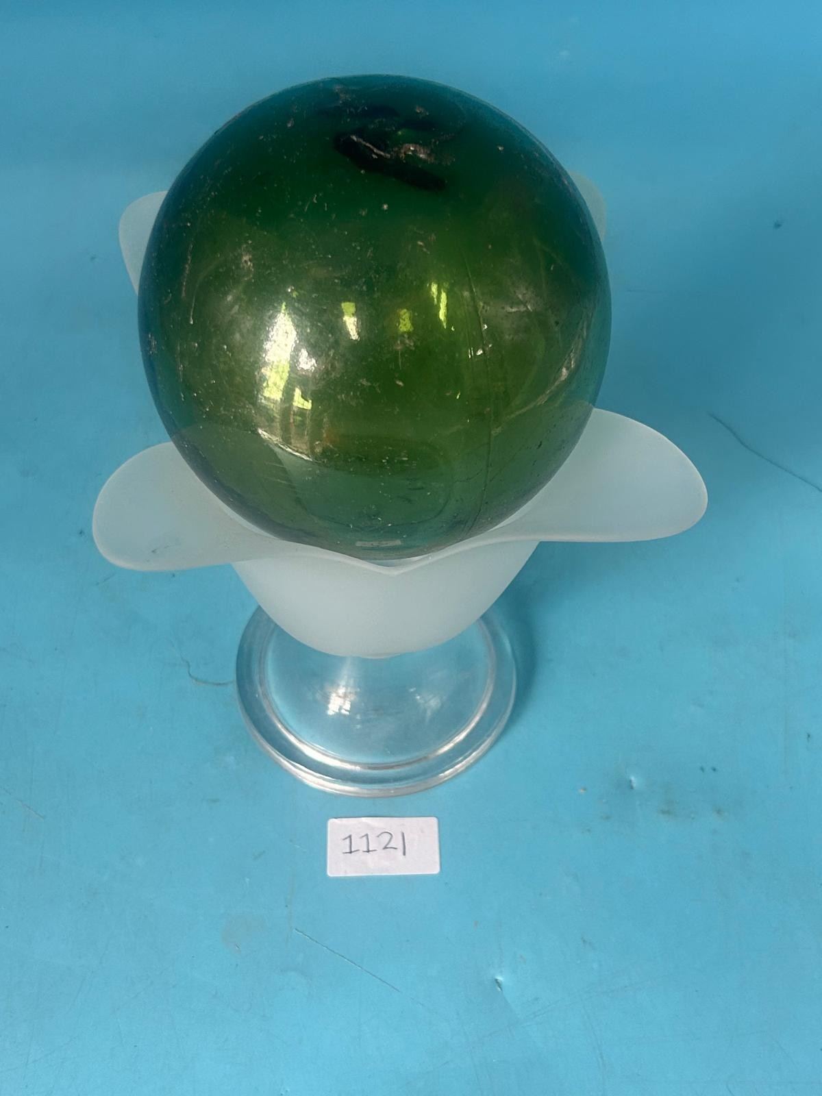 A dark green glass sphere with minor imperfections rests on a frosted flower-shaped pedestal with a clear glass base.
