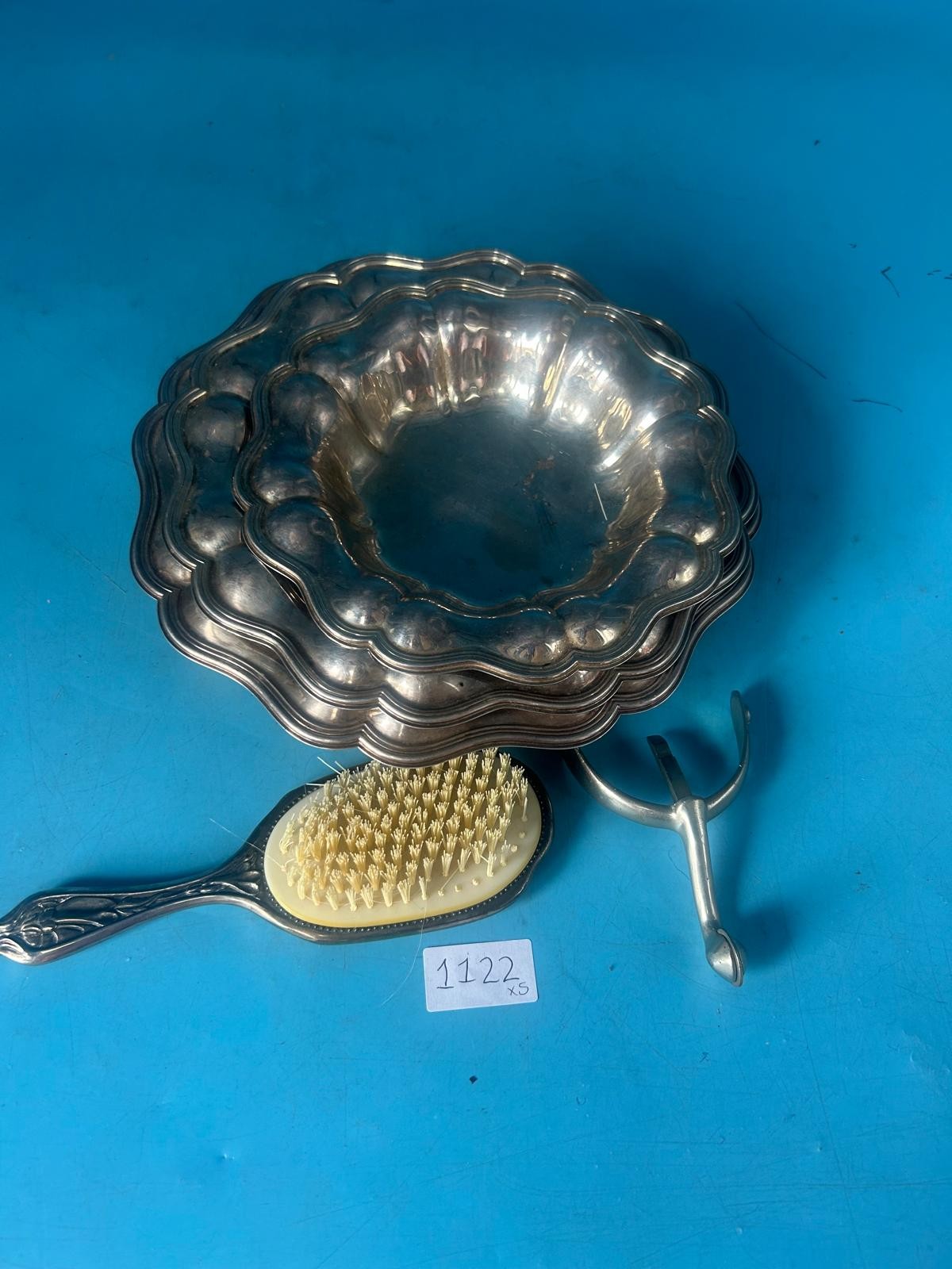 Stacked silver-colored scalloped-edge dishes, a hairbrush with a detailed handle, and a metal spur.
