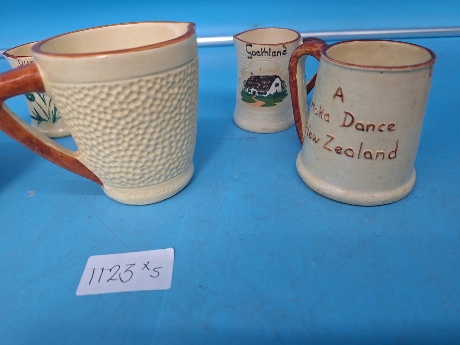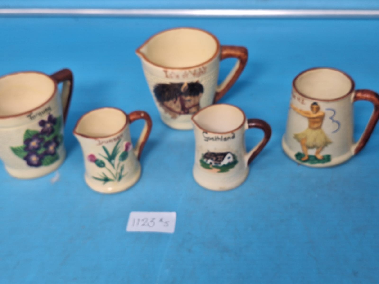 Collection of ceramic jugs featuring painted designs of violets, thistles, a horse, a cottage, and a Haka dance.