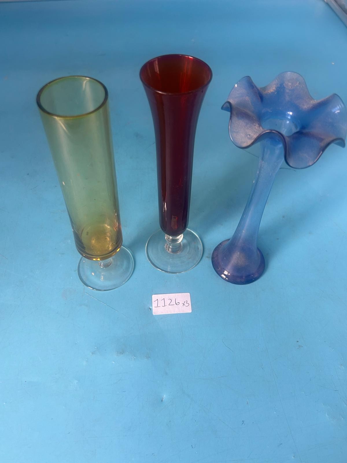 Cylindrical amber vase with flared clear base, funnel-shaped dark red vase with clear base, and a ruffled light blue vase with slender stem.