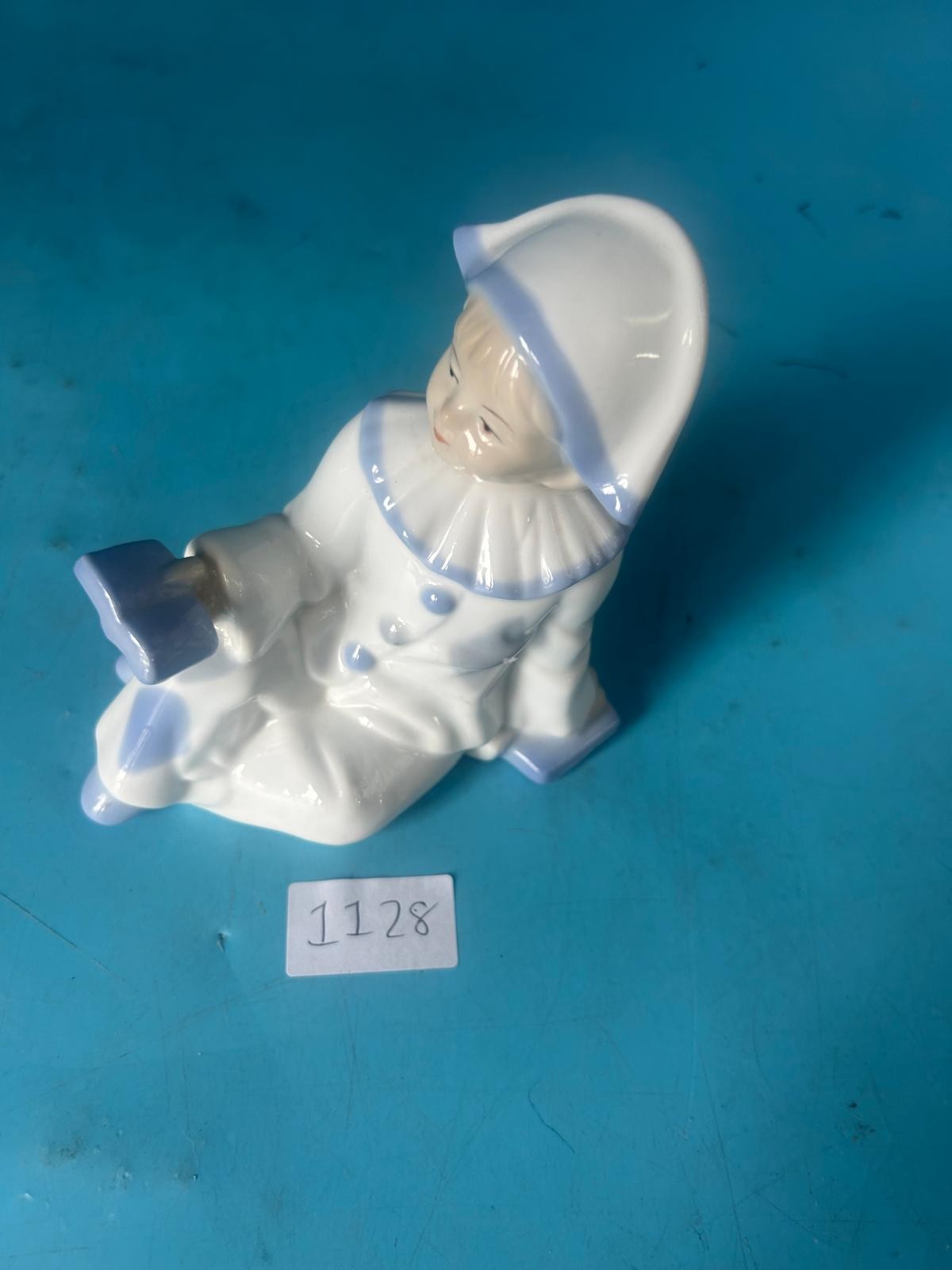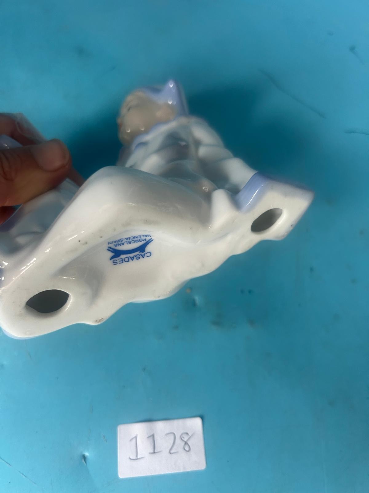 White and blue porcelain figurine of a child in a jester-like outfit holding a bell, made in Spain.