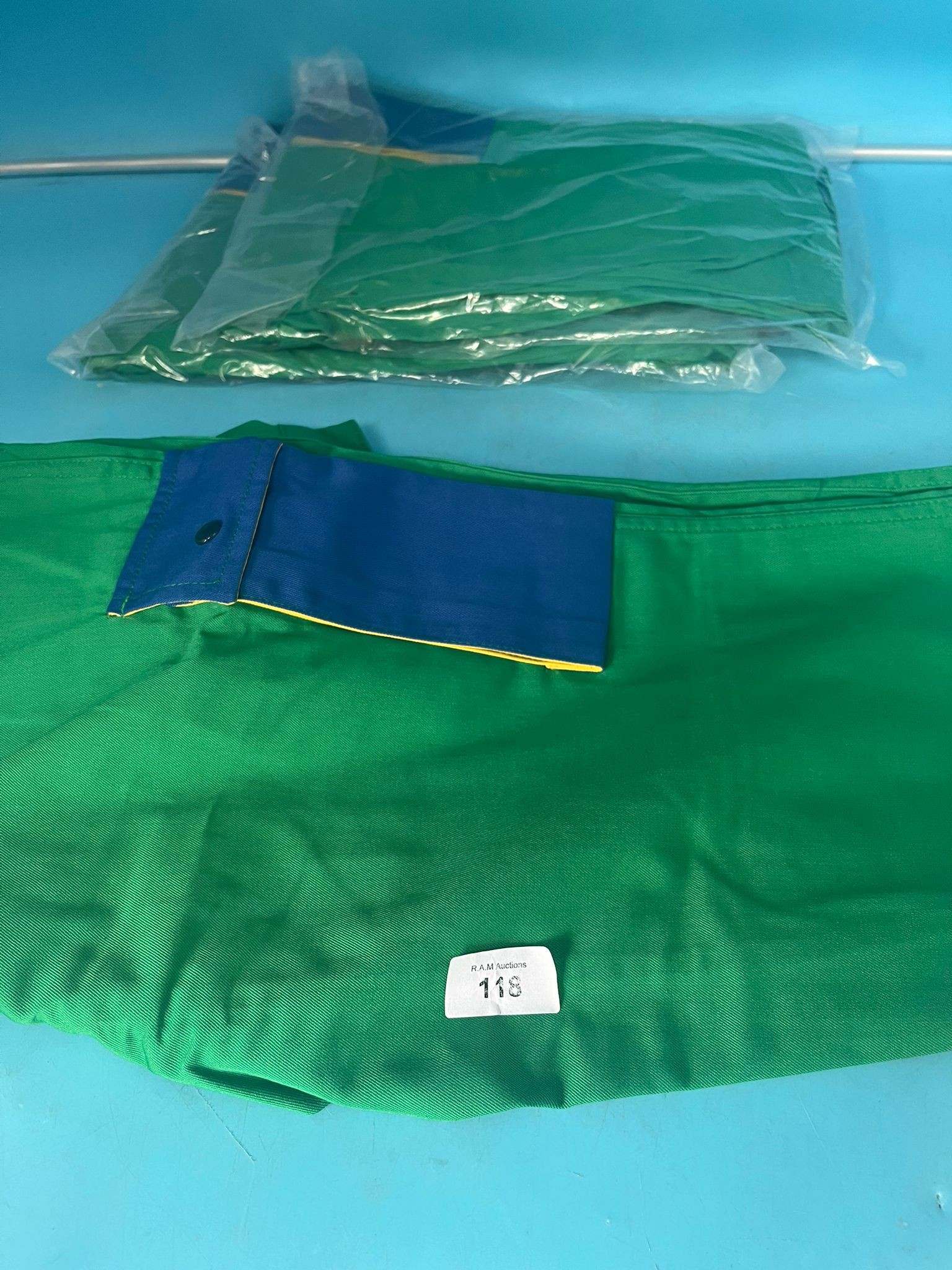 Bright green woven fabric with a dark blue patched accent and button.