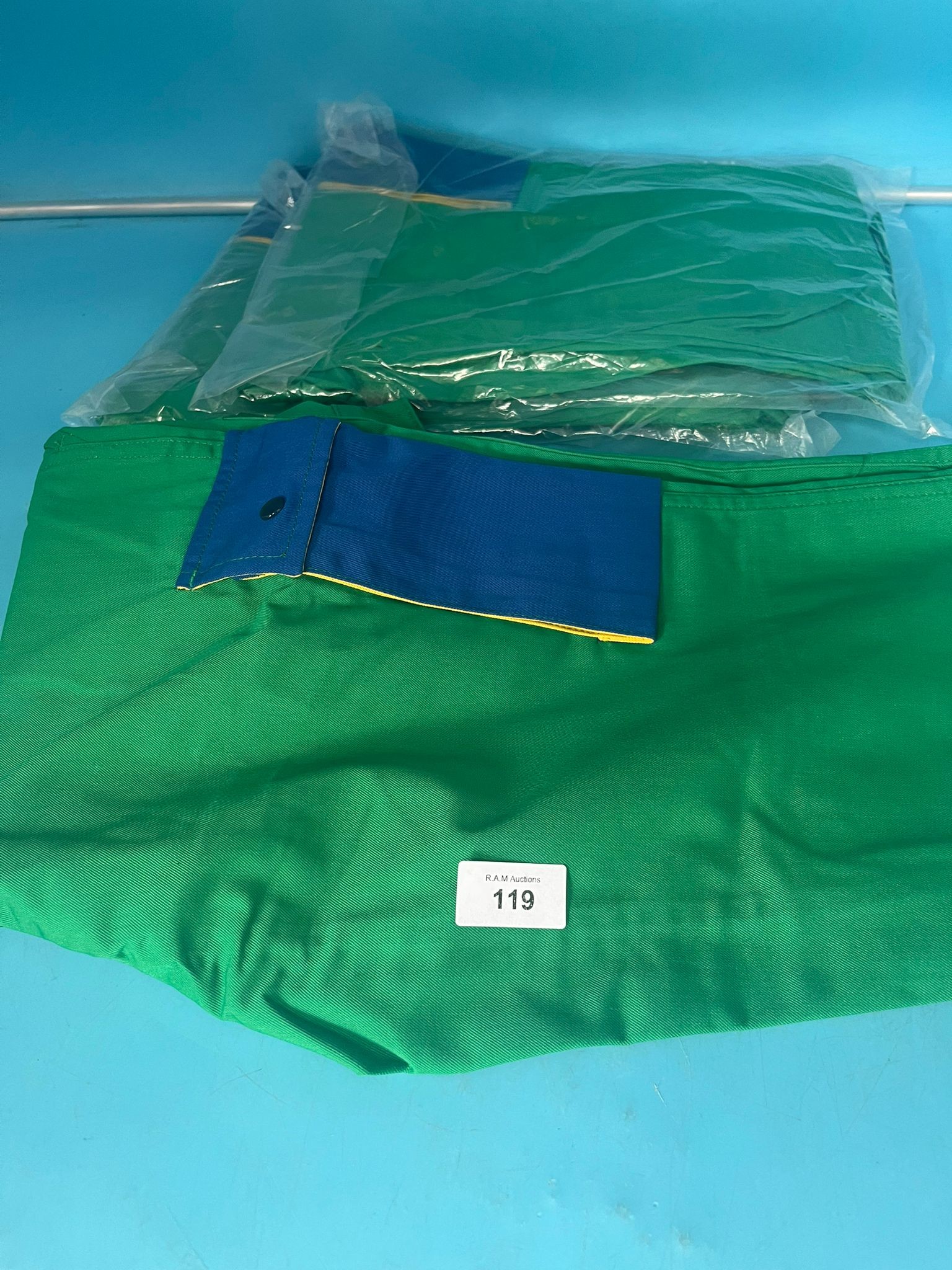 Folded bright green fabric with a dark blue fabric piece and yellow border attached by a button.