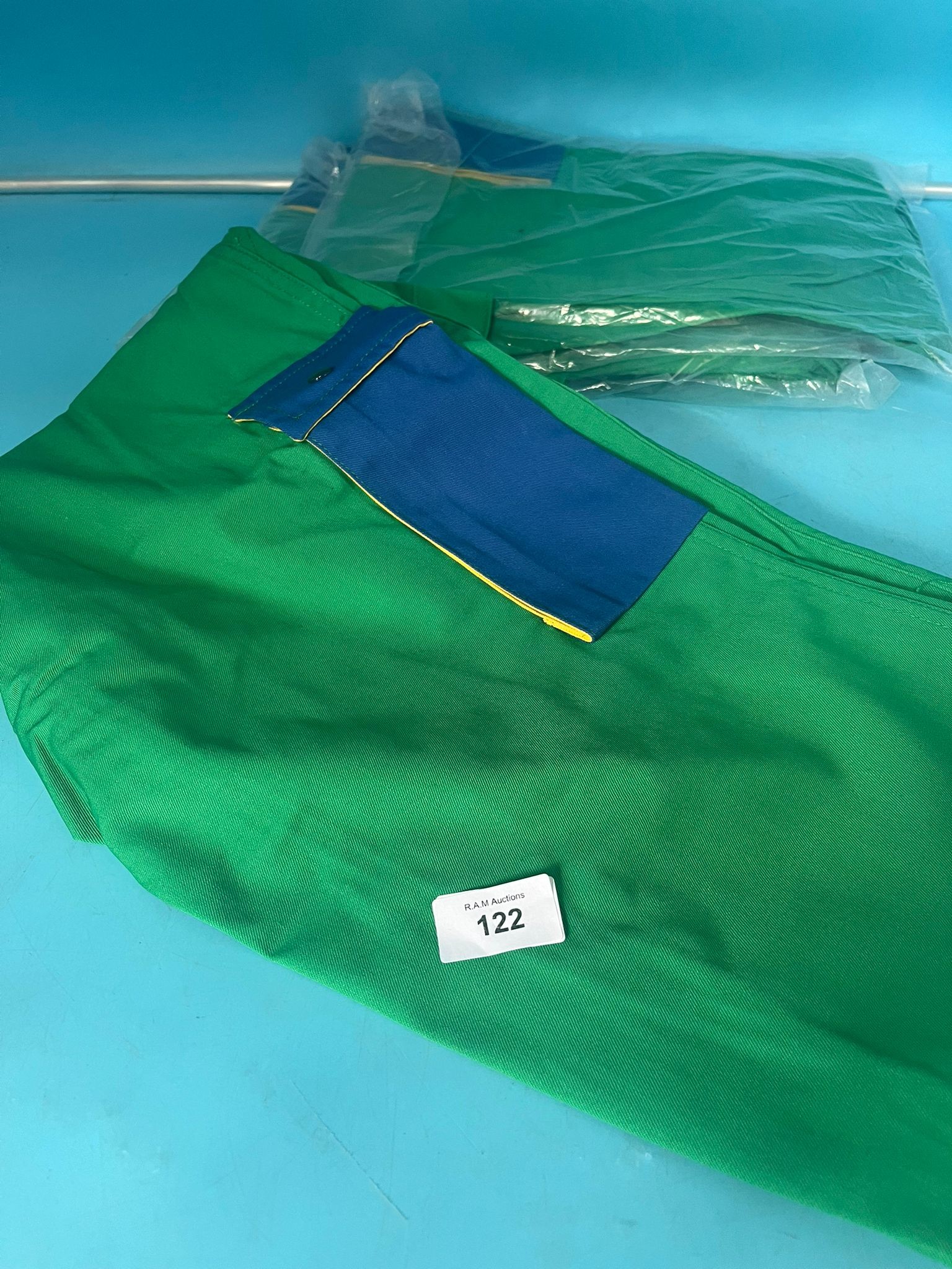 A bright green ribbed fabric swatch with an attached dark blue fabric patch featuring a yellow stripe and a single button.
