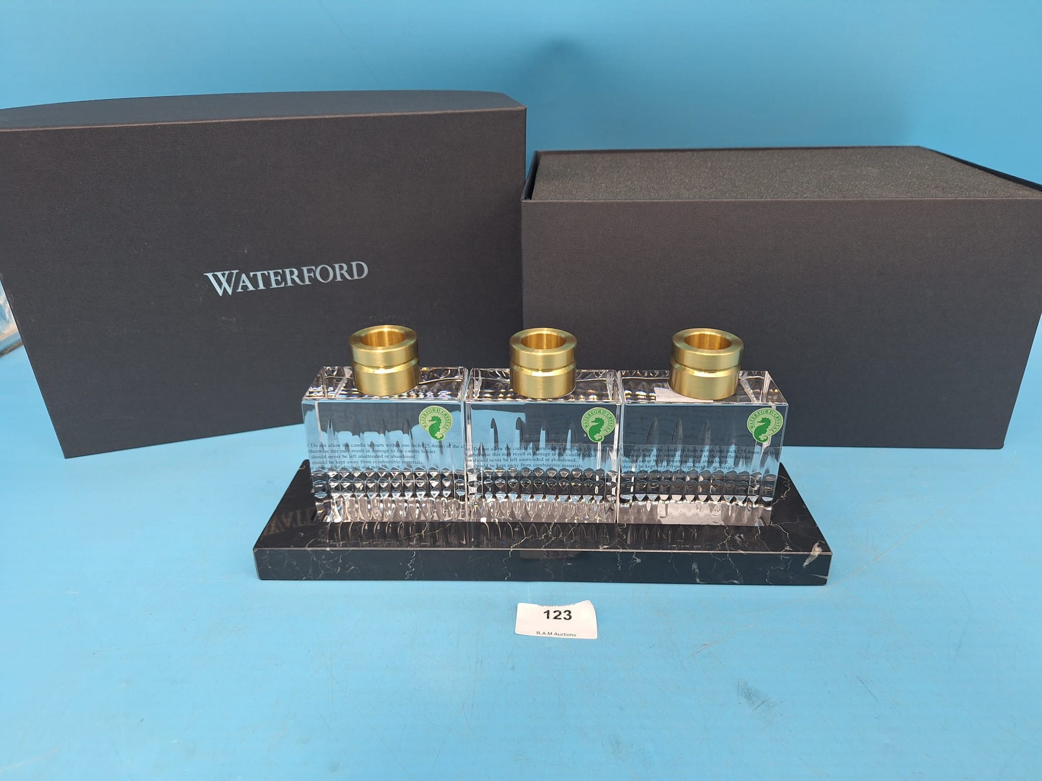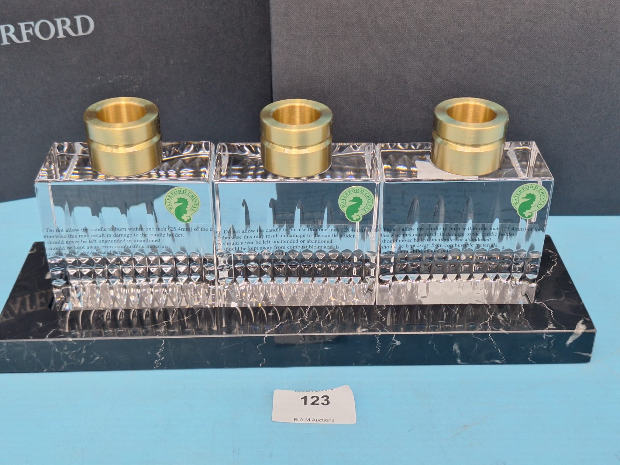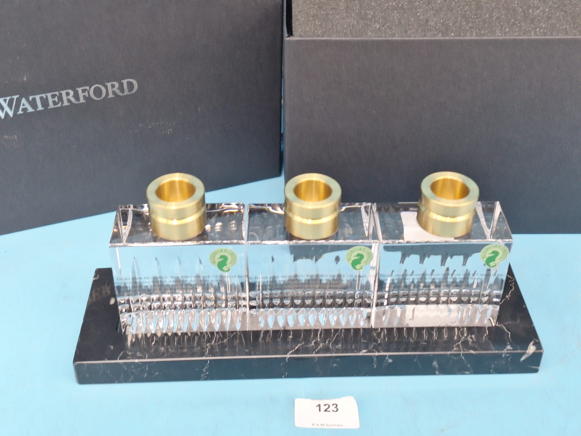 Three glass candle holders with textured pattern and brass cups on a black base, presented in a Waterford box.