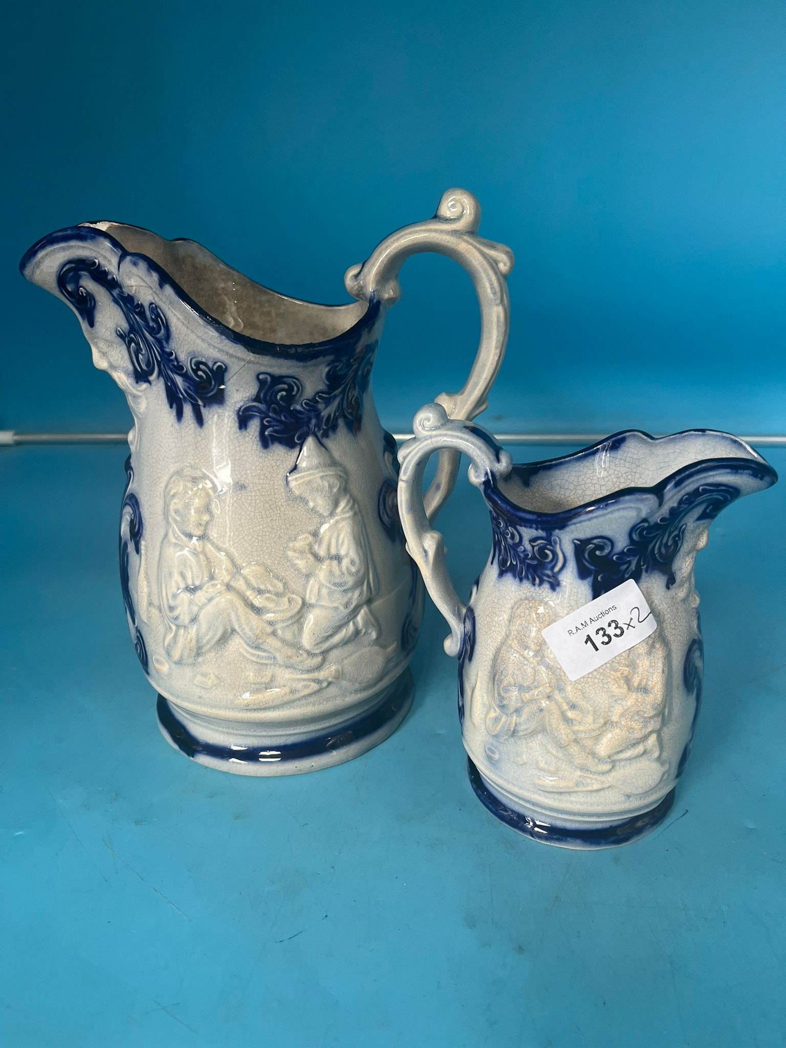 Off-white ceramic pitcher with blue floral scroll pattern and raised relief figures.