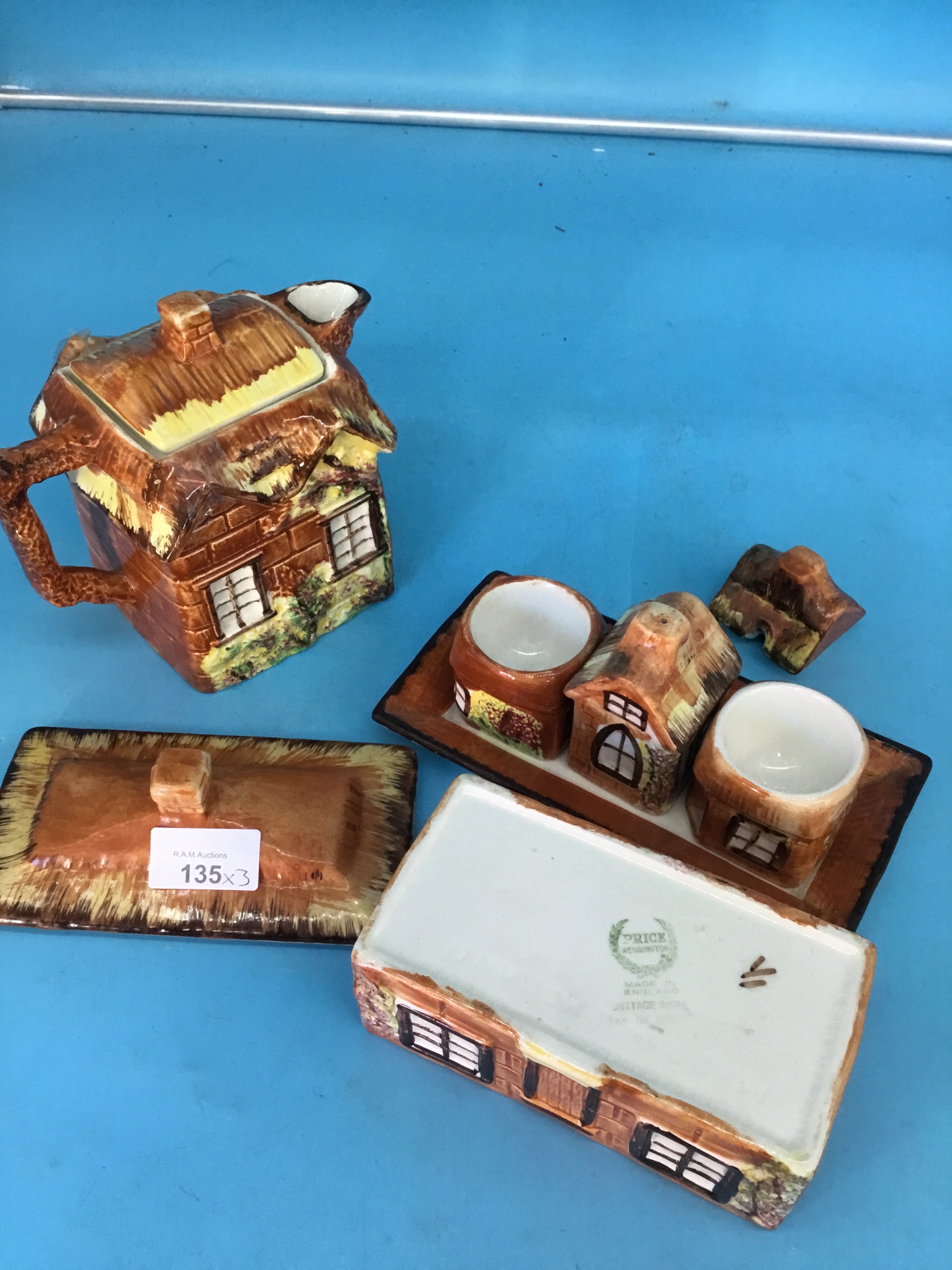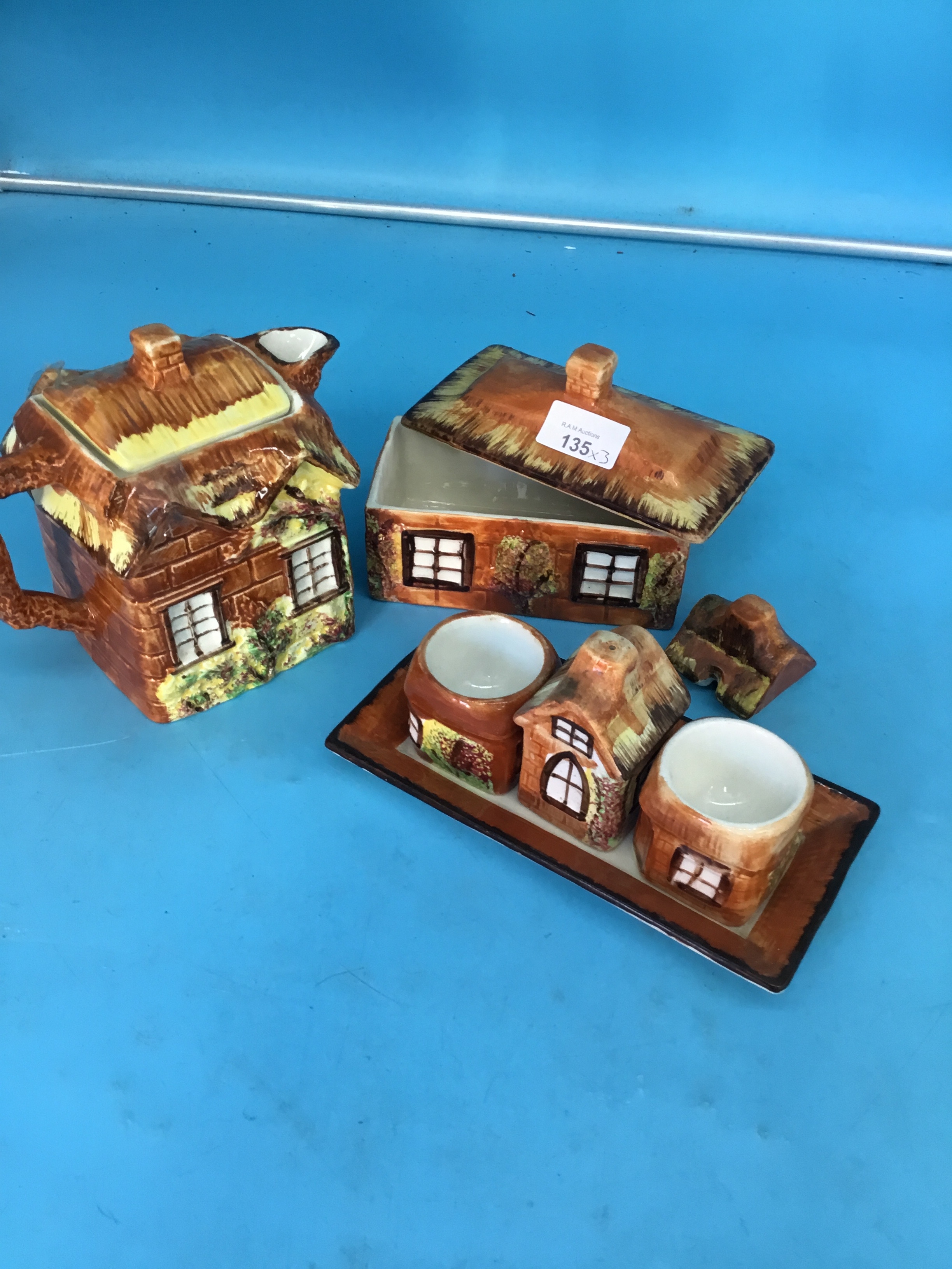 Ceramic cottage-themed teapot, sugar bowl, and egg coddler set with thatched roof cottage designs.